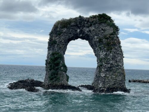 そして奥尻島一番のシンボルへ!鍋釣岩(なべつるいわ)です。昔のいろりにかける鉄鍋の丸い取っ手に形が似ているのでこの名前が付いたそうです。