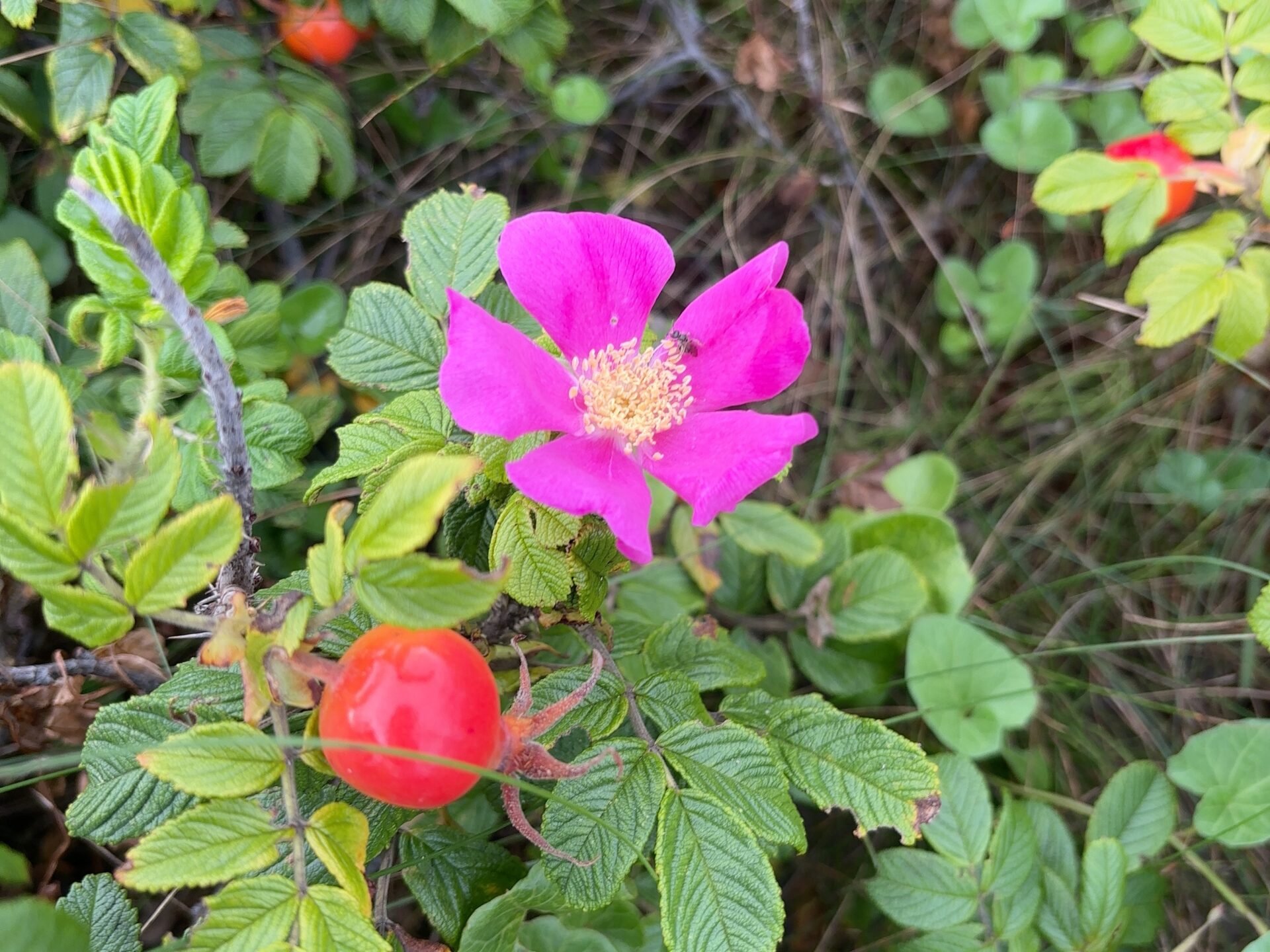 河口近くなので、淡水の貝も混じっていました。赤い実はハマナスの実です。