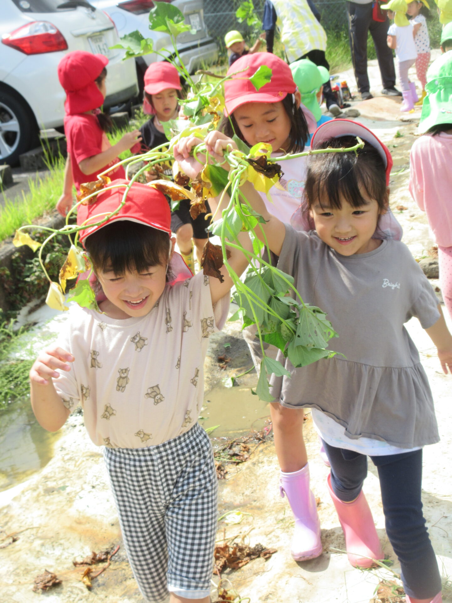 それでも、芋を掘る際にツルが邪魔になるのは確かなので、根元から10㎝ほどを残して保育者が切っていくと、子どもたちがせっせと運んでくれました。