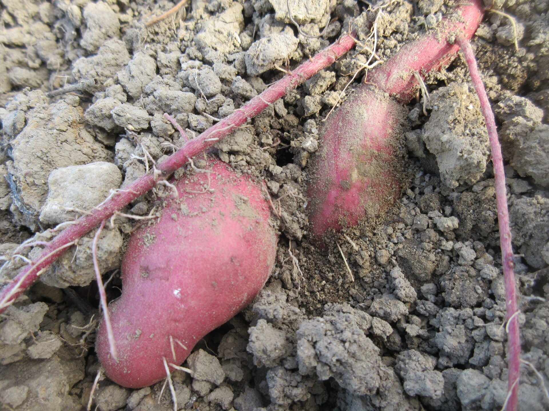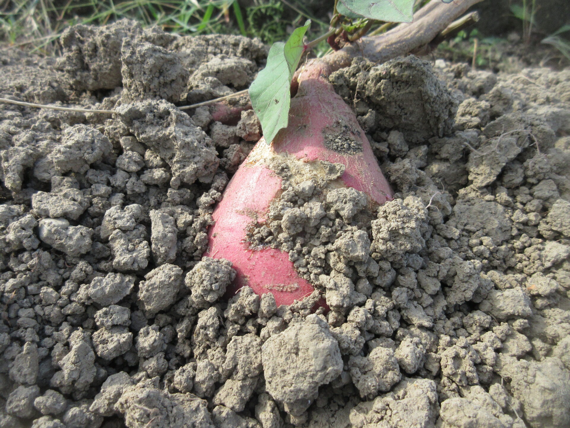 おお~!前回少しだけ掘り起こしてみた時よりも、ぐんと大きくなったさつまいもが顔を出していました。