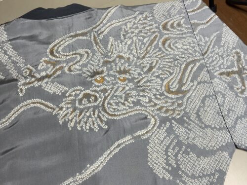 同じ着流しでも、こちらは絞り染めを使ったものです。生地の一部を糸でくくって、染まらない部分を作って染められます。