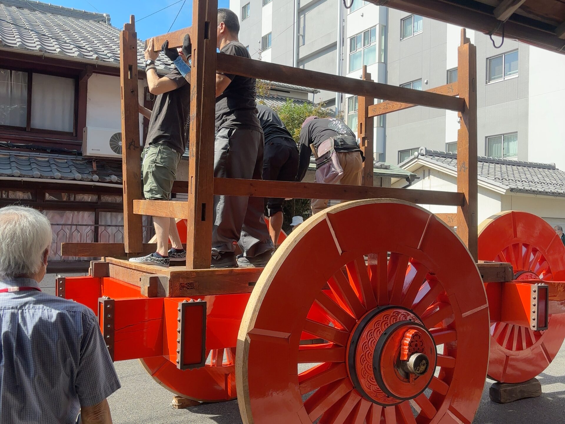 10月6日(土)には山建てがありました。曳山を倉庫から出して組み立てていきます。