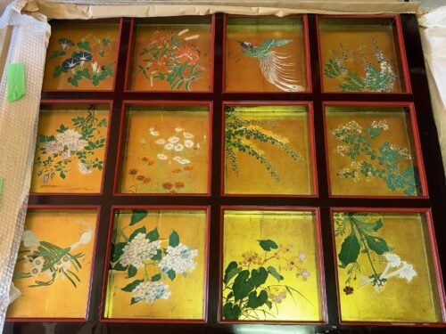 曳山の天井画です。江戸時代の画家によるもので、朝顔・鬼ゆり・藤・ぼたん・菊・山吹・萩など季節の花々が描かれています。