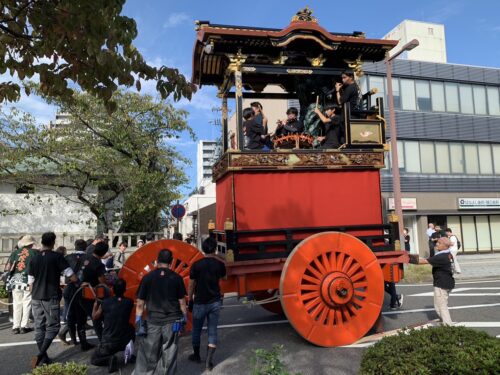 その後、実際に試し曳きをします。私も曳山の上で演奏をしました。