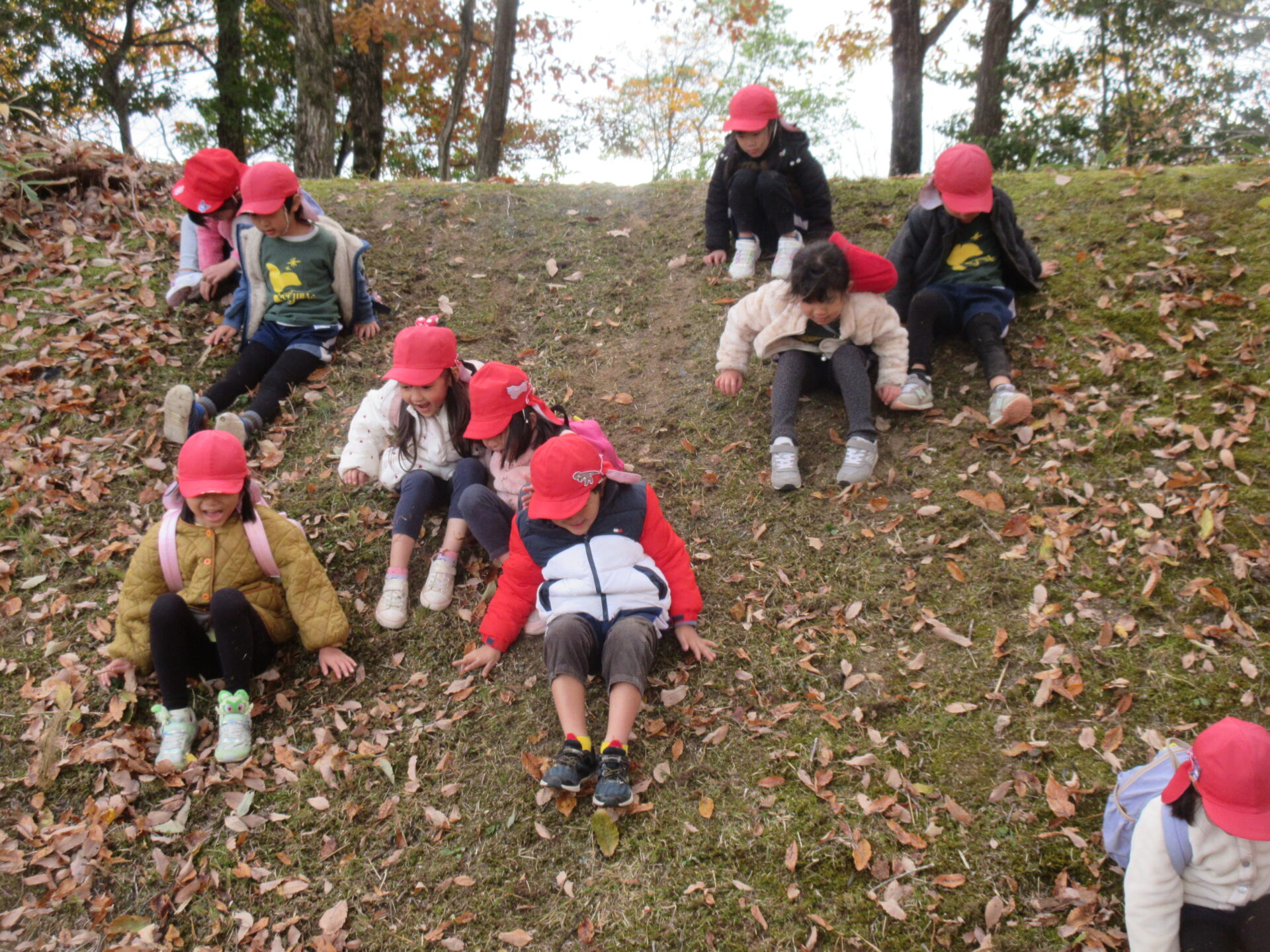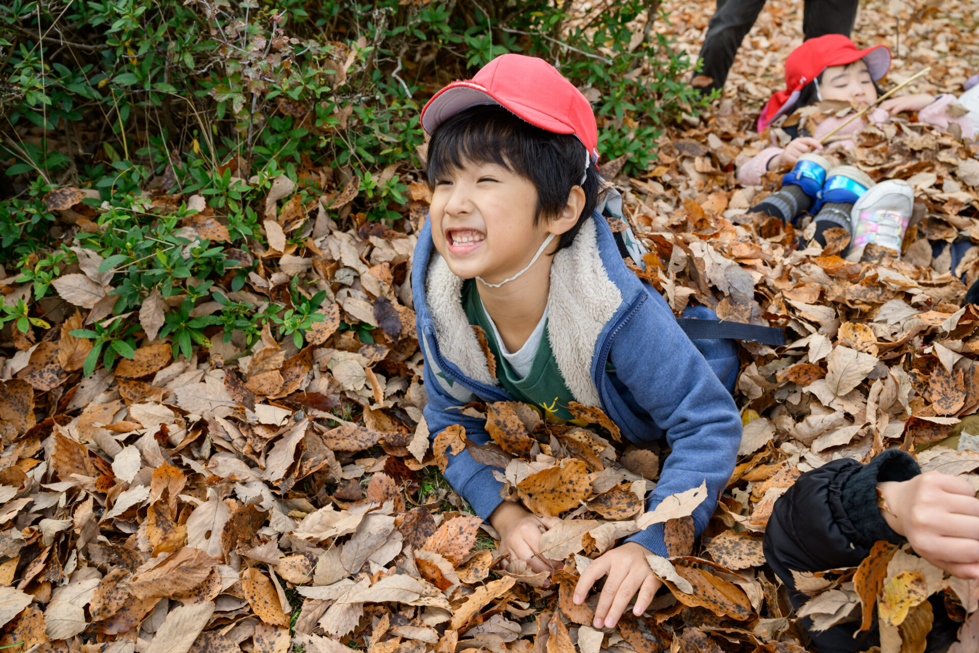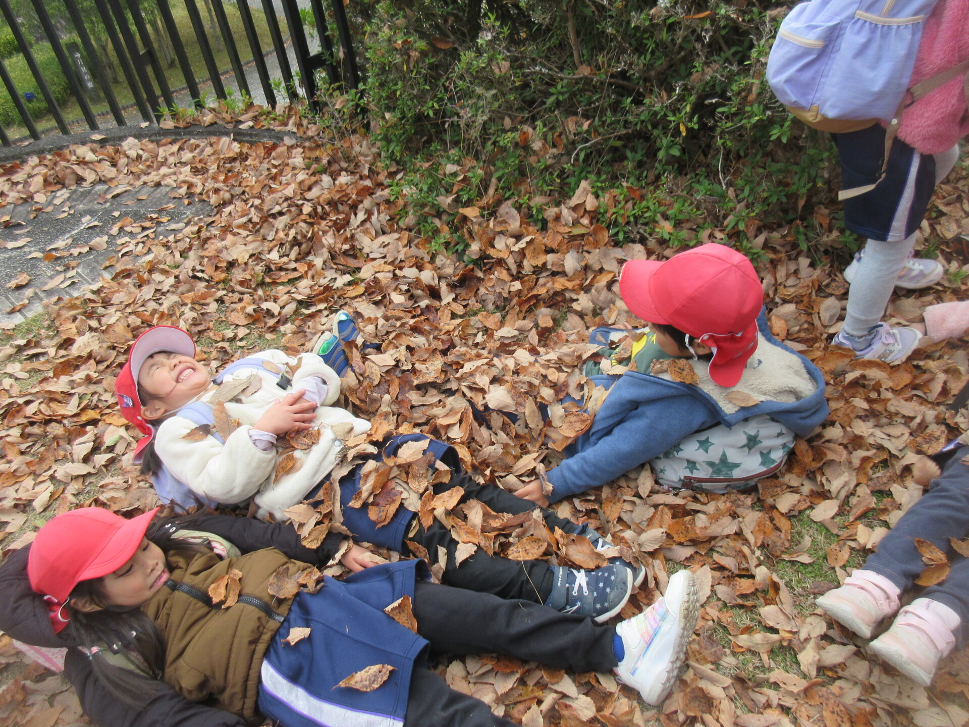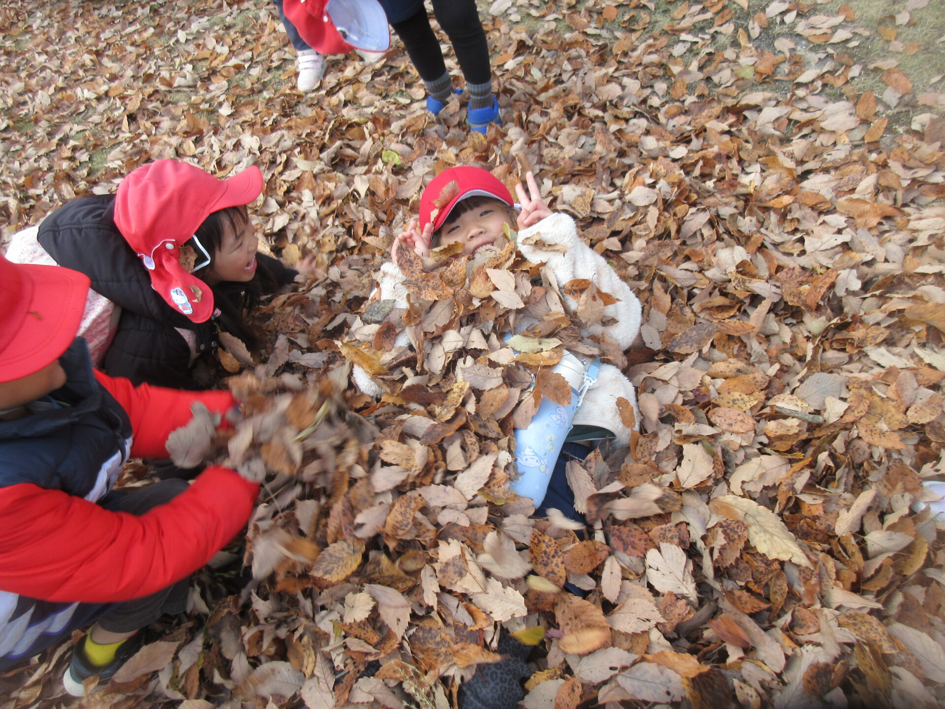 落ち葉の中から出てきたのは…5歳児くじらチームの子どもたち!