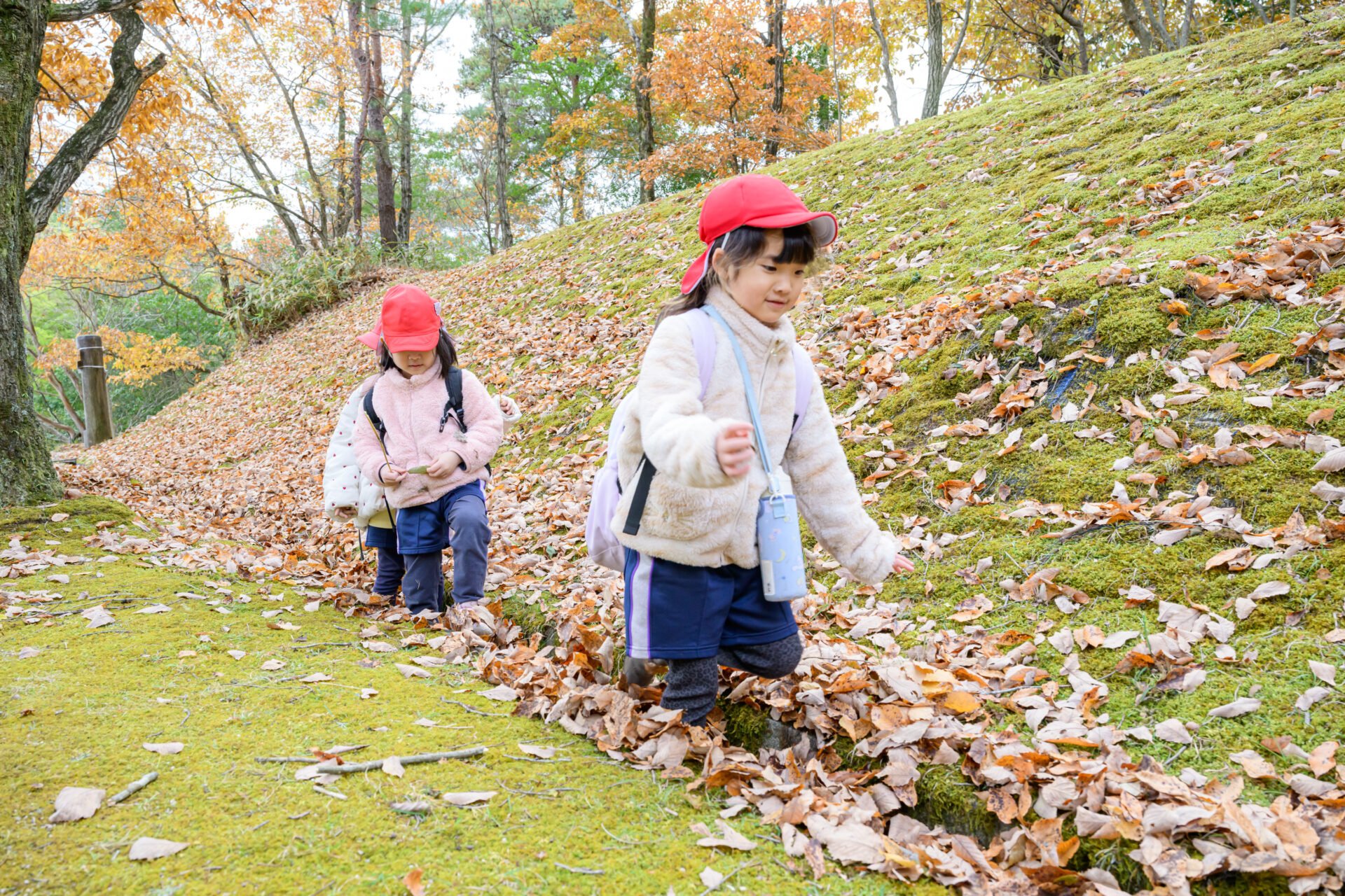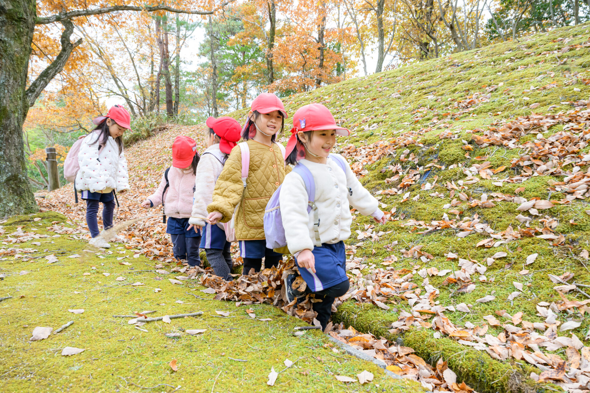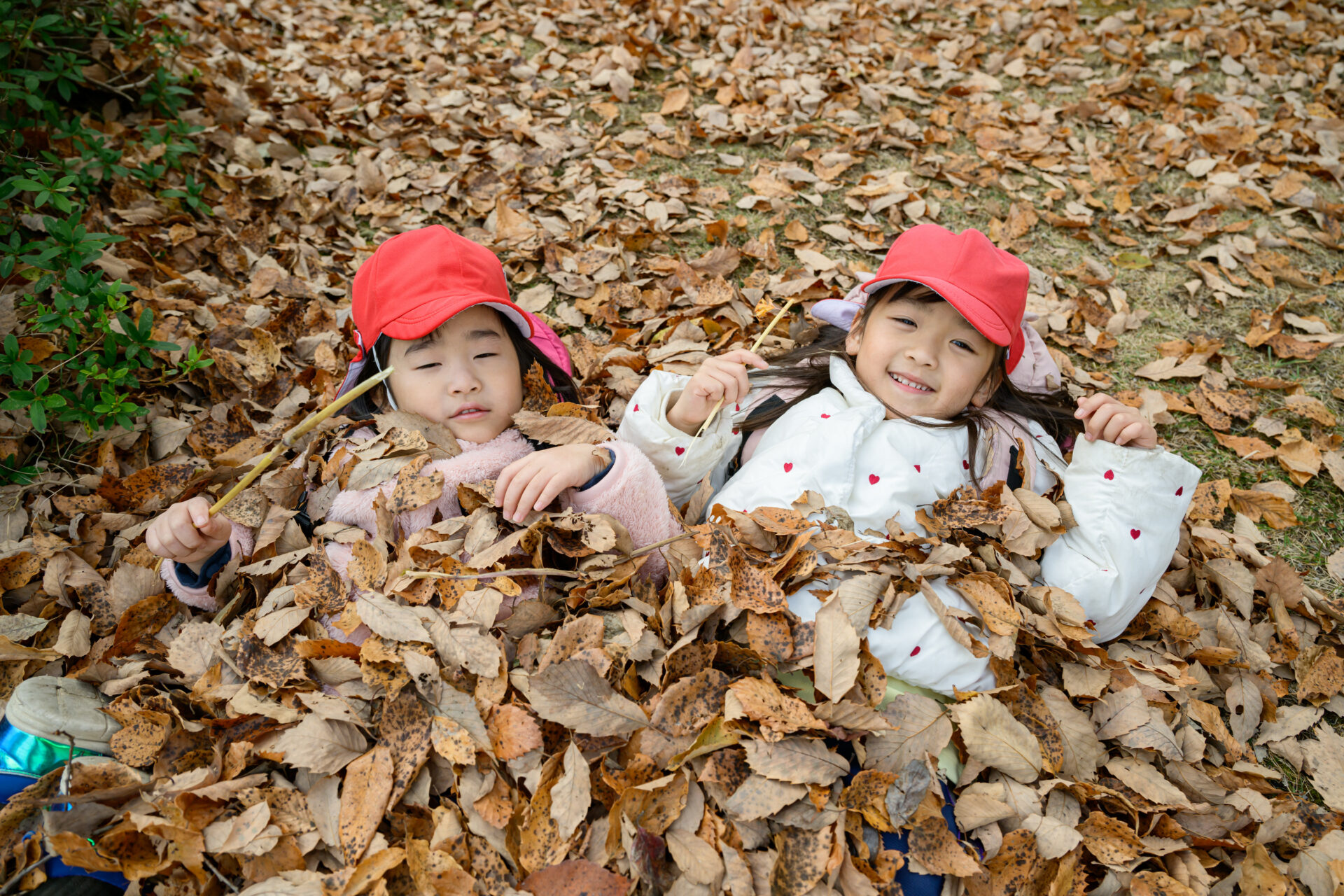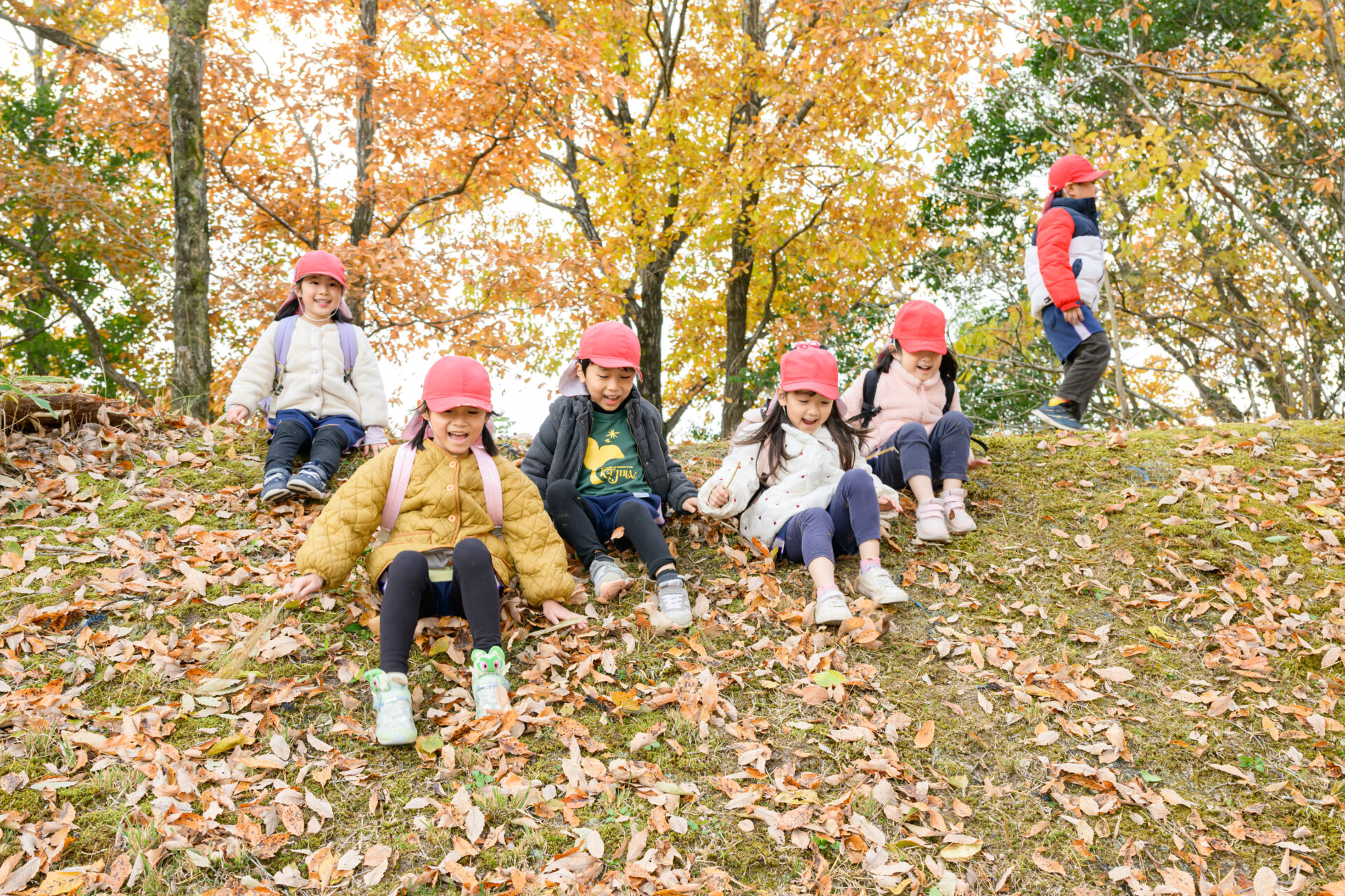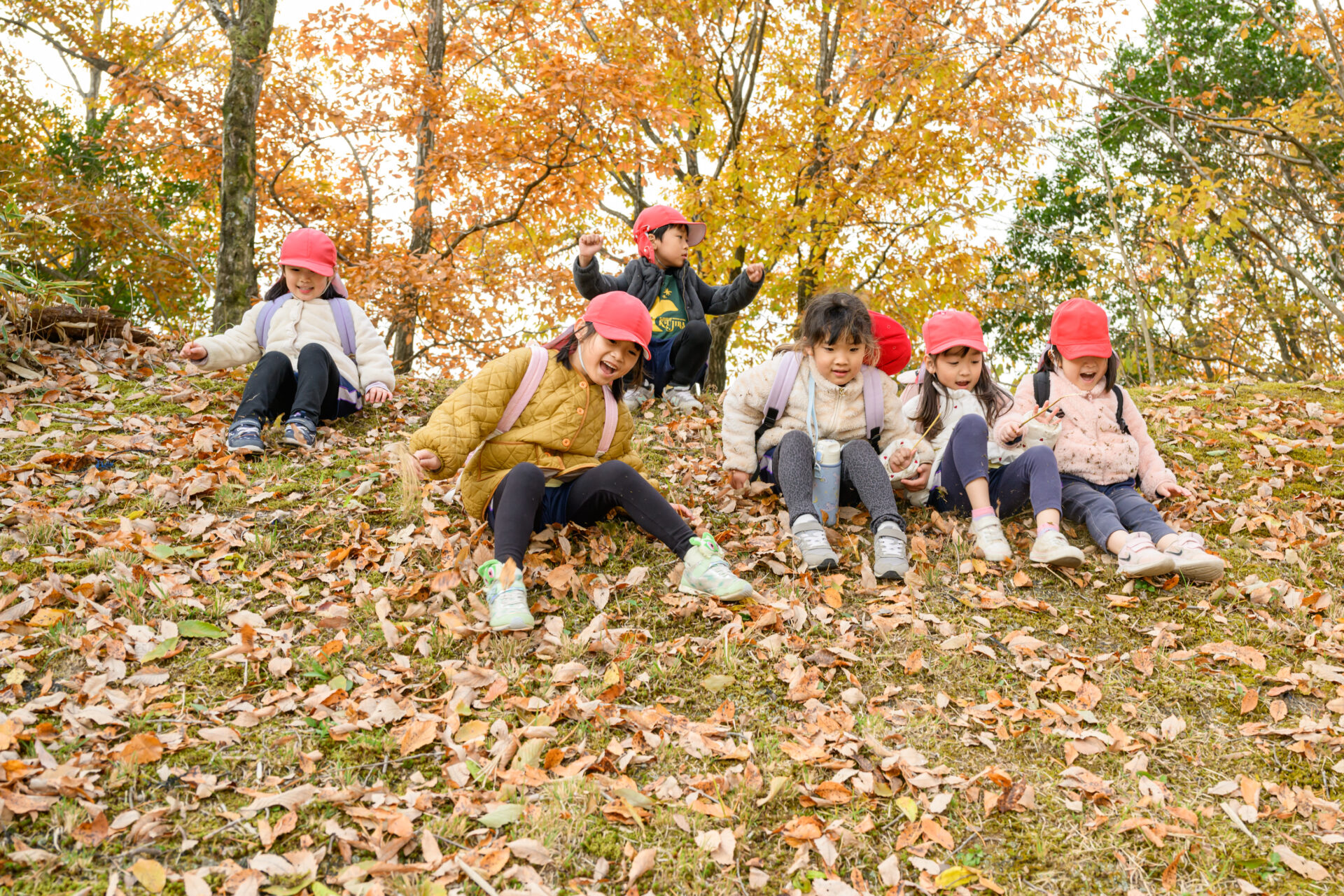 落ち葉の中から出てきたのは…5歳児くじらチームの子どもたち!