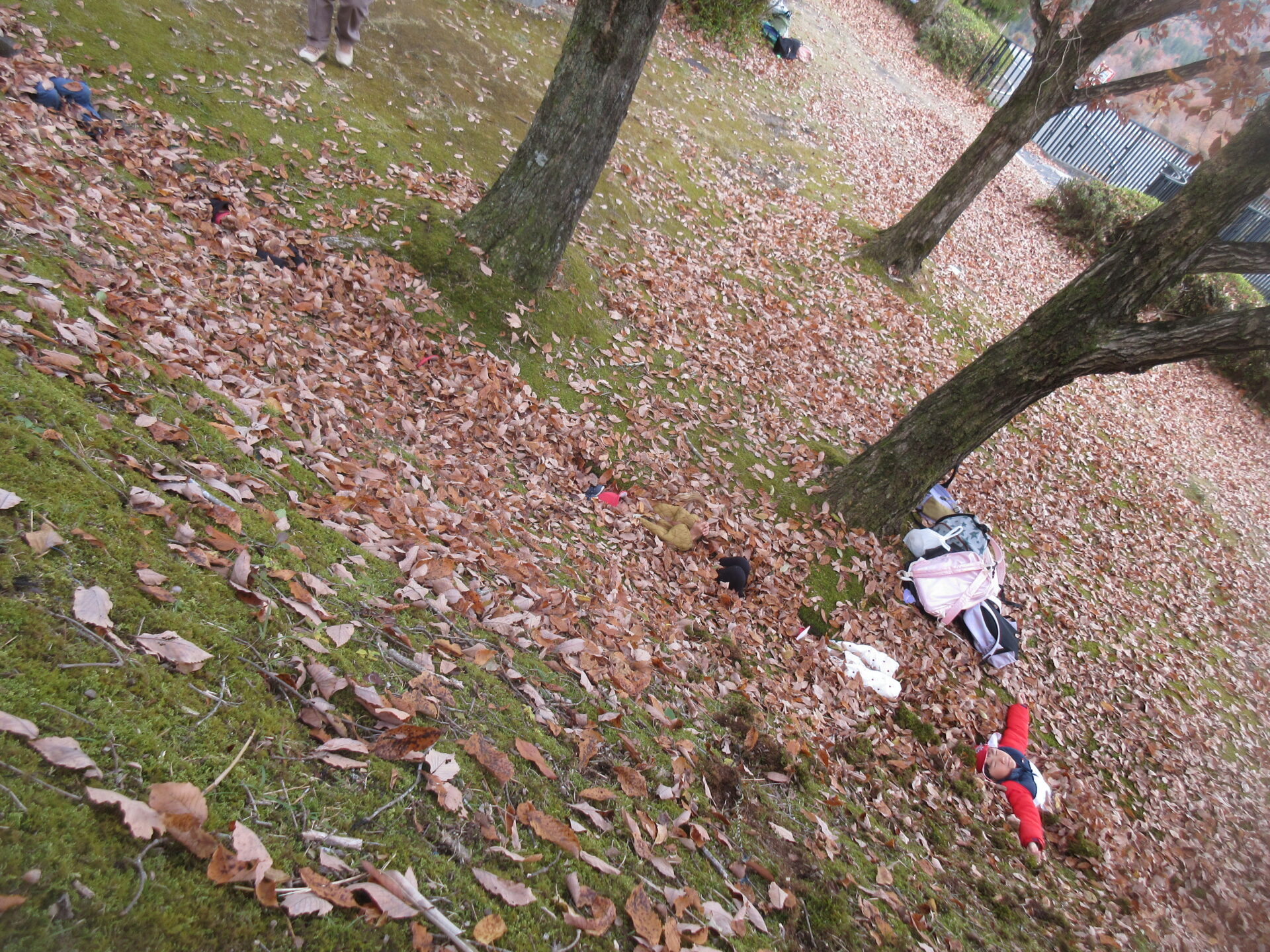 信楽の『陶芸の森』の奥にある風の塔にて、たくさんの落ち葉があり、寝そべって頭から足先まですっぽりかぶったり、斜面すべりをしたり…自然の中でたくさん遊んできました。