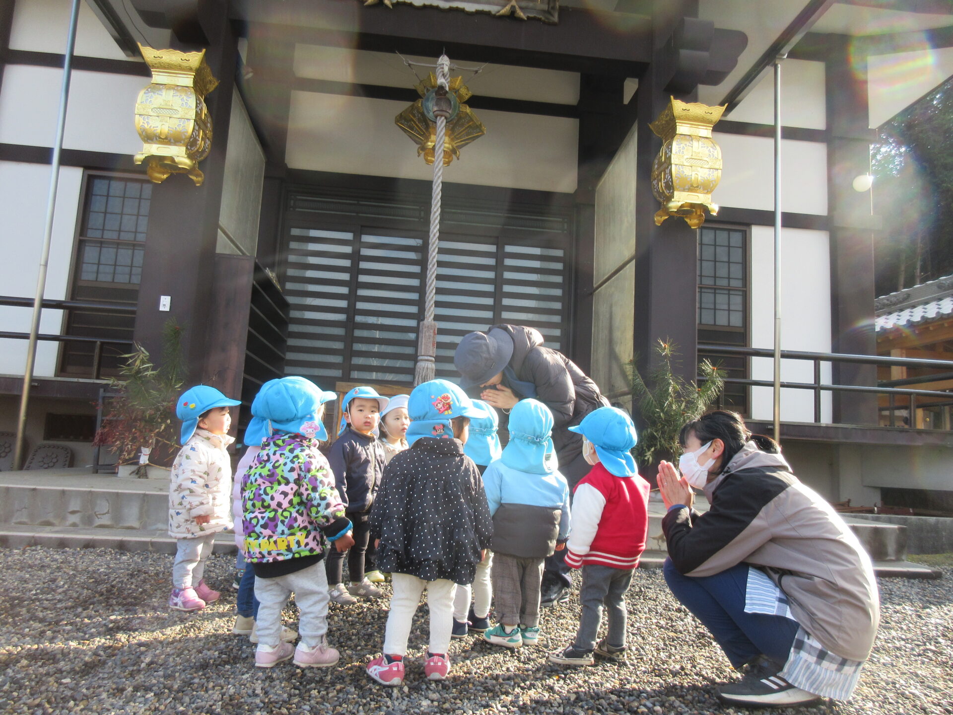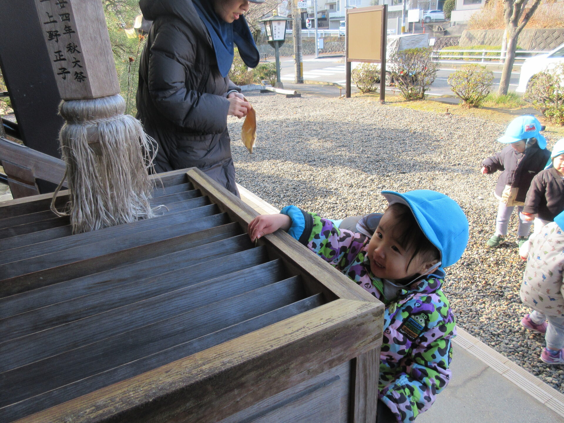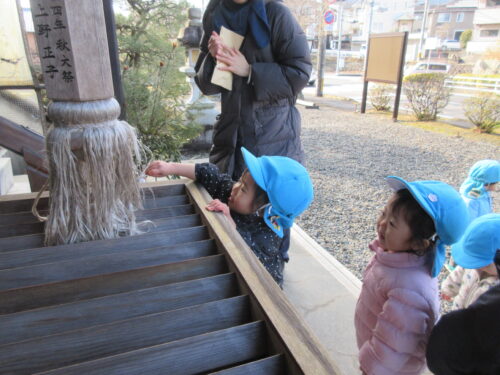 保育者から話を聞き、一人ひとりお金を賽銭箱に入れ、見様見真似でお参りです。