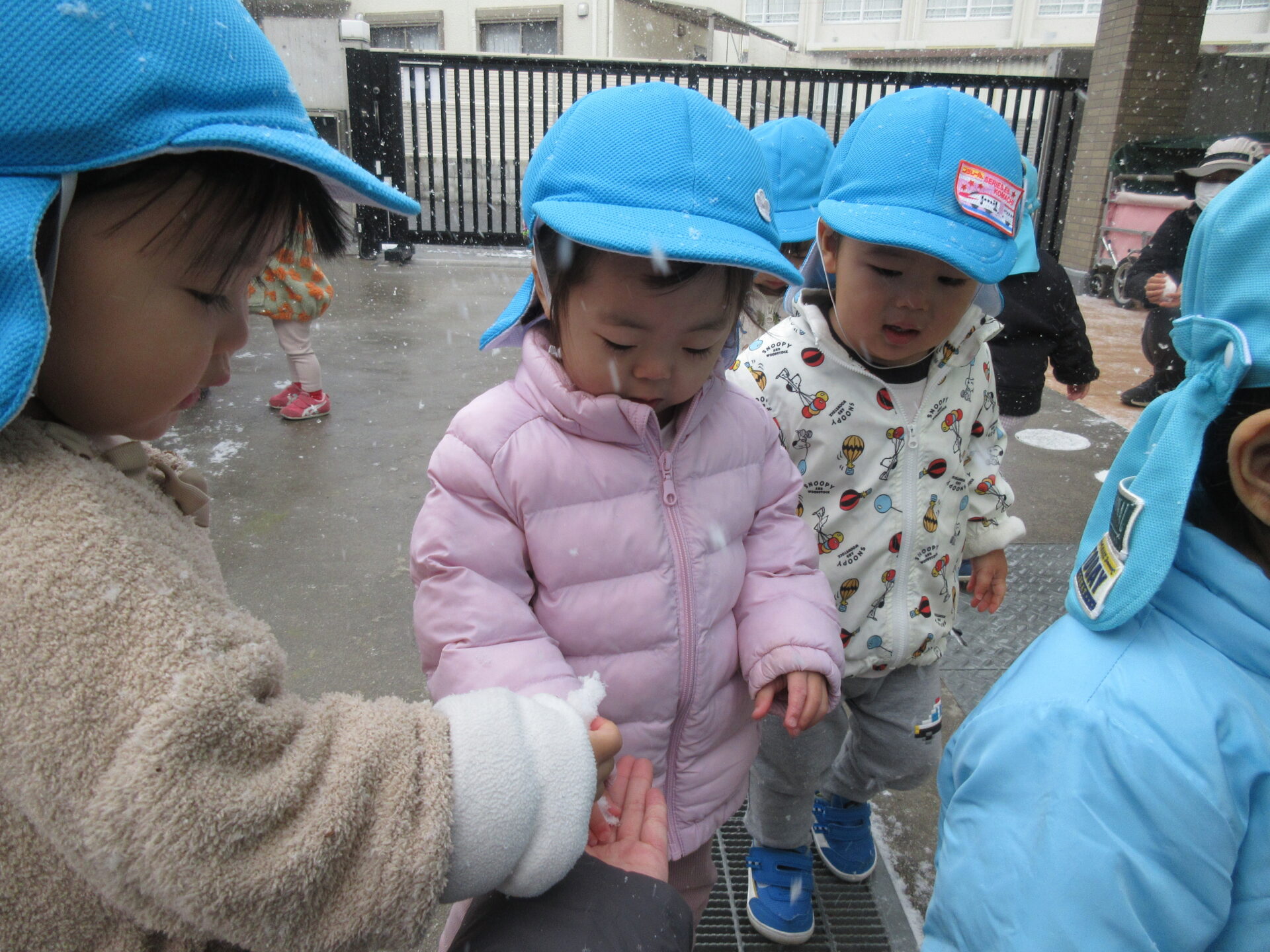 保育者が雪を集めて「見て見て~」と手に乗せると、「冷たいね~」「雪!!」と大興奮。