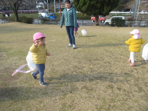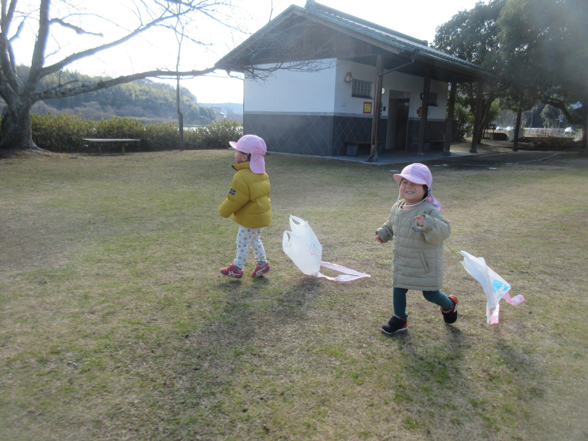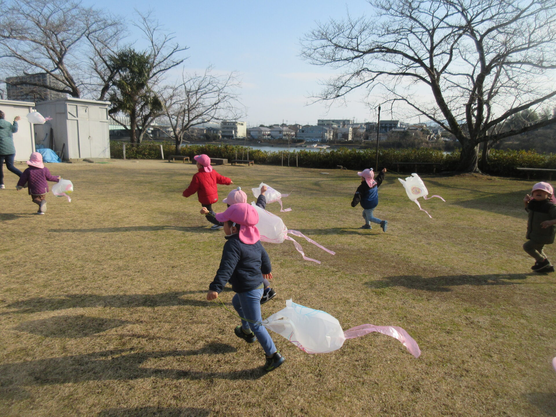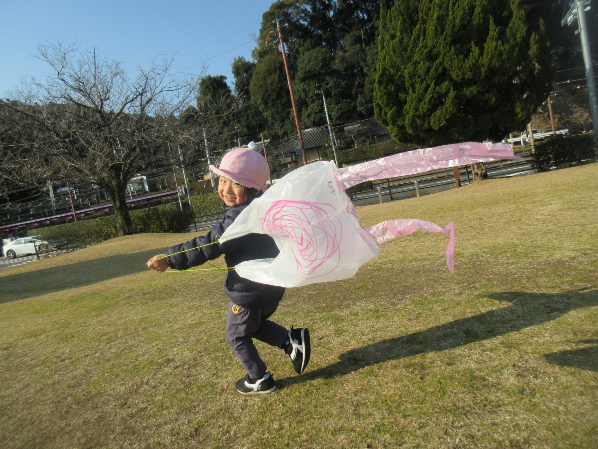 大風が吹くと、走らなくても凧がプカプカと上がり、立ち止まっての凧あげも楽しみました。沢山走って体もポカポカしてきて、「寒い」というお友だちは1人もいませんでした。楽しくって「まだ帰りたくない」と言ってくれたので「明日も凧あげしよう」と伝えると、明日を楽しみに、見通しを持って保育園に帰ることができました。