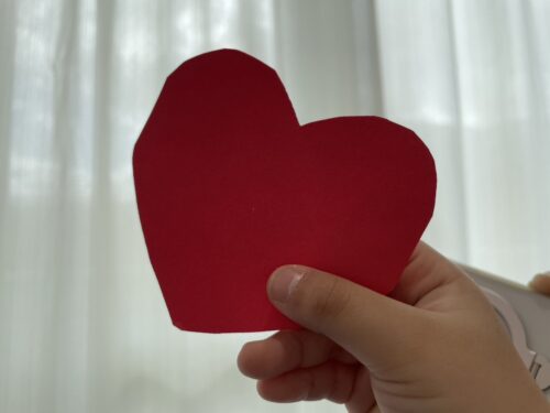更に「卵子って、どれぐらいの大きさだと思う?」この質問の後に子どもたちに配られたものは、ハートの形の画用紙。でも、よーく見てみると・・・真ん中に、針の先をさして開けた小さな小さな穴が。