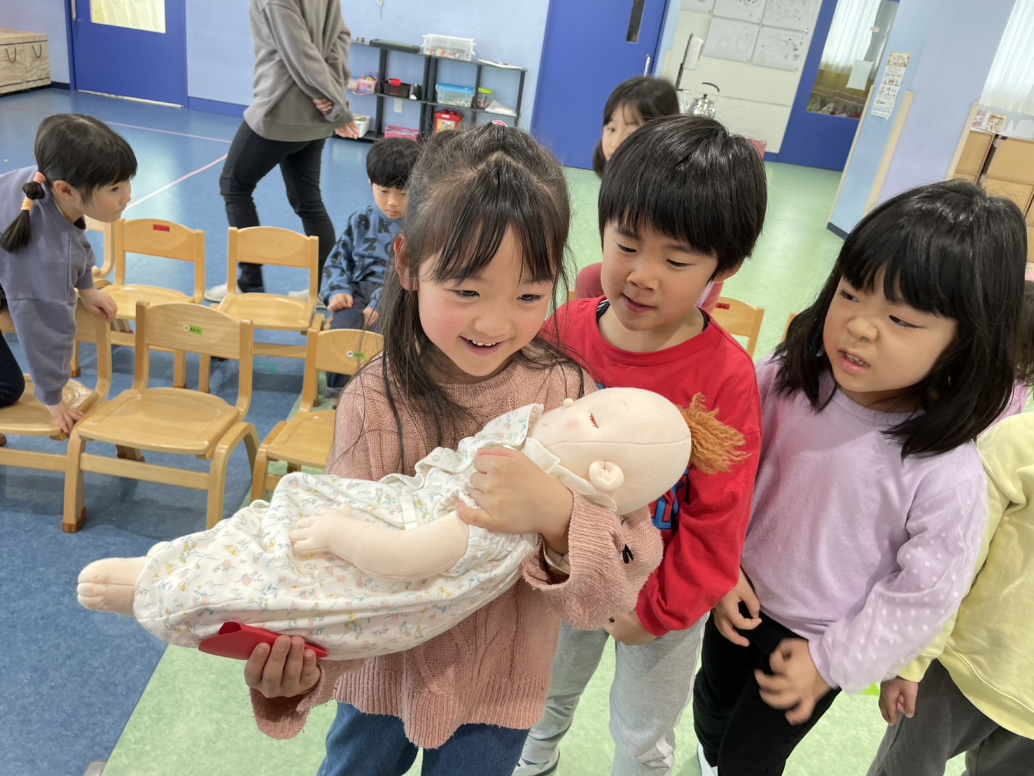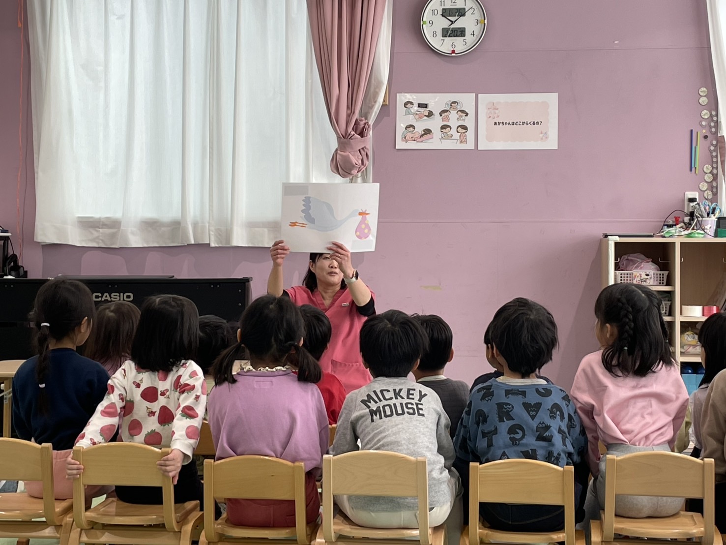 実は、5歳児クラスの保護者さんに助産師さんがおられるのですが、派遣講師さんとしてご指名させていただくと、快く引き受けて下さり、去る2月20日(木)石山くじら保育園にて、4・5歳児に講義を行ってくださいました。