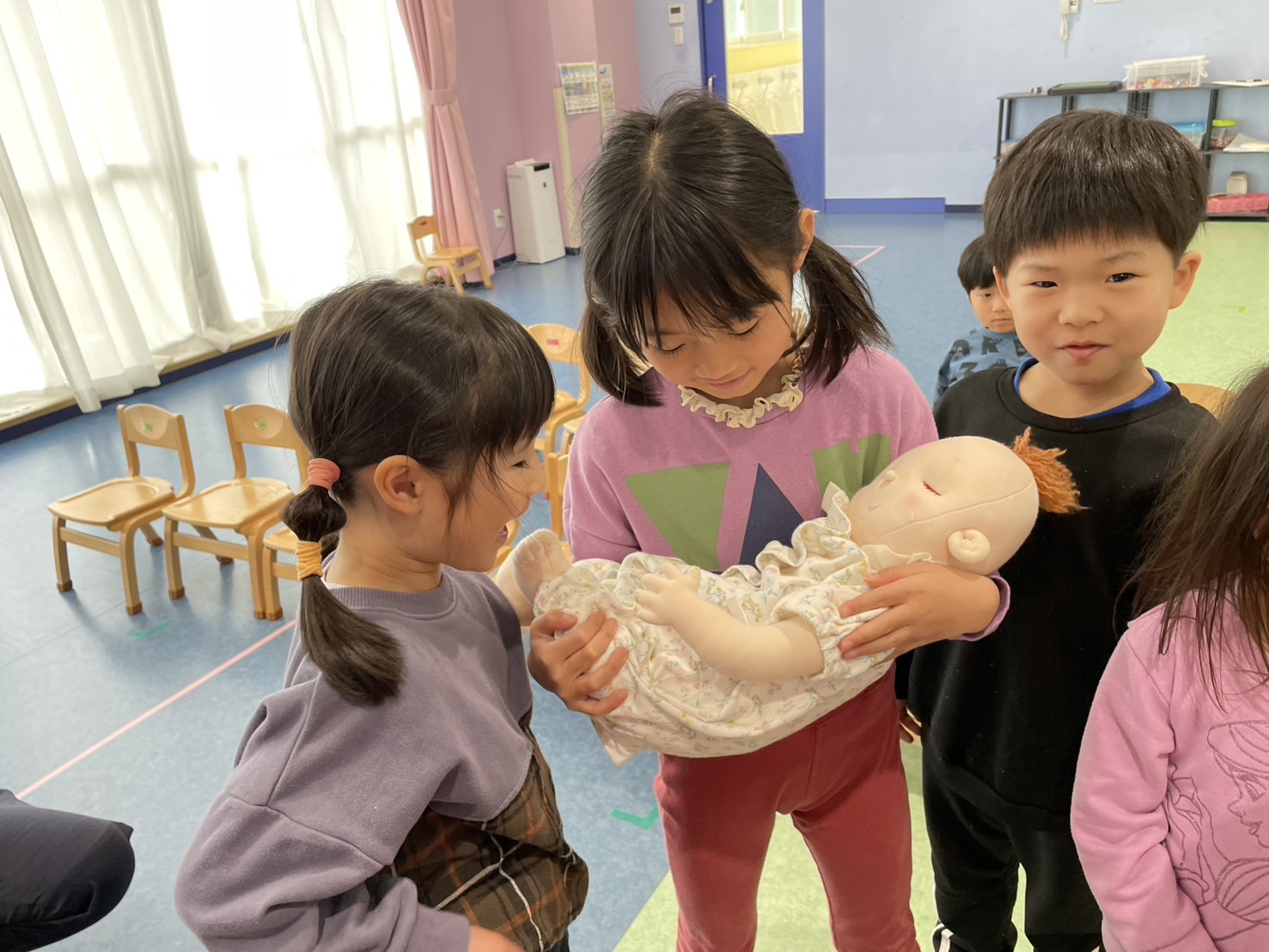 最後に、生まれたての赤ちゃんと同じお人形(50㎝・3000g)を、抱っこさせてもらいました。首も座っていないので、しっかり支えてあげなくてはいけません。