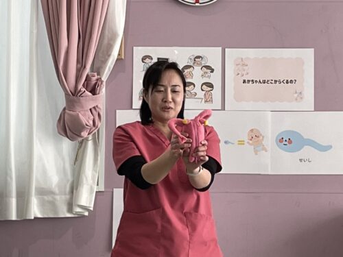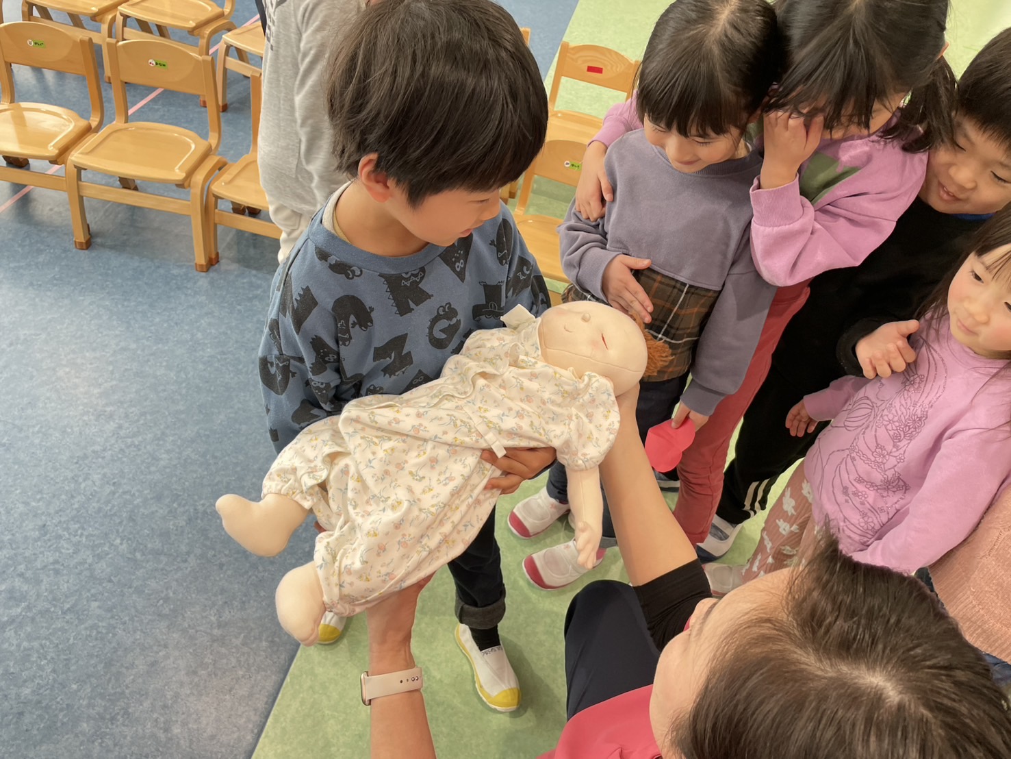 まずは「助産師さんって、知ってる?」というところから、助産師は赤ちゃんを産む時にお手伝いをする仕事だということ、みんなは生まれた時に泣いていたから覚えていないと思うけれど、1番に赤ちゃんを抱いて、お母さんに「生まれましたよ」と渡す人だということを、子どもたちにわかりやすく教えてもらいました。