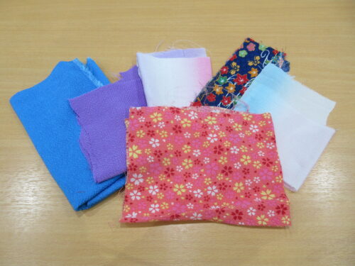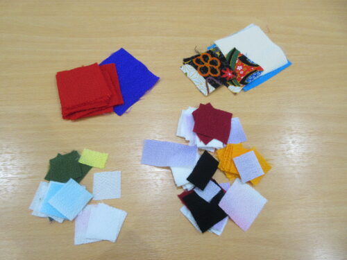 これを裁断して色々な大きさの正方形にします。着物の生地を使うこともあります。