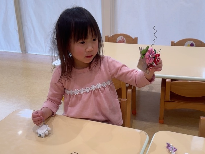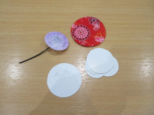 針金のついた台紙を組み合わせてかんざしにしたり、ひもを使って下がりを作ったり。