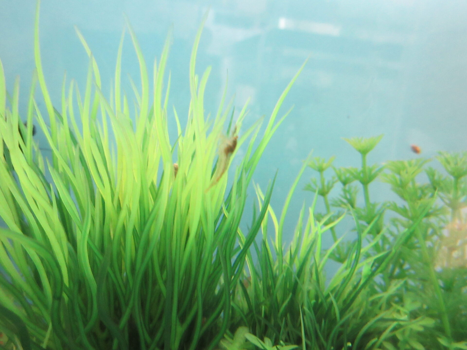 その後、保護者の方より「メダカと一緒にエビも飼われませんか?」と声をかけていただき、水槽のお掃除やさんとして仲間入り。
