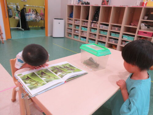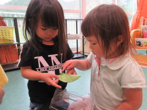 図鑑を見ながら、黒色からみどりの青虫に脱皮っする事や、どんなちょうちょが生まれるのかをお話しながら、成長を見守る毎日。