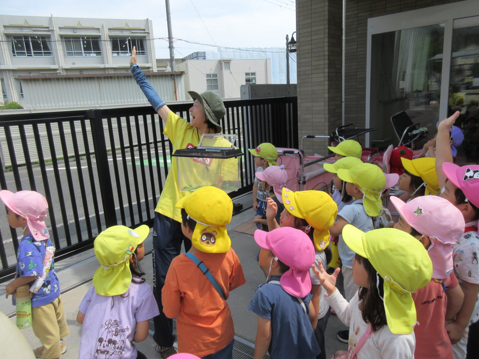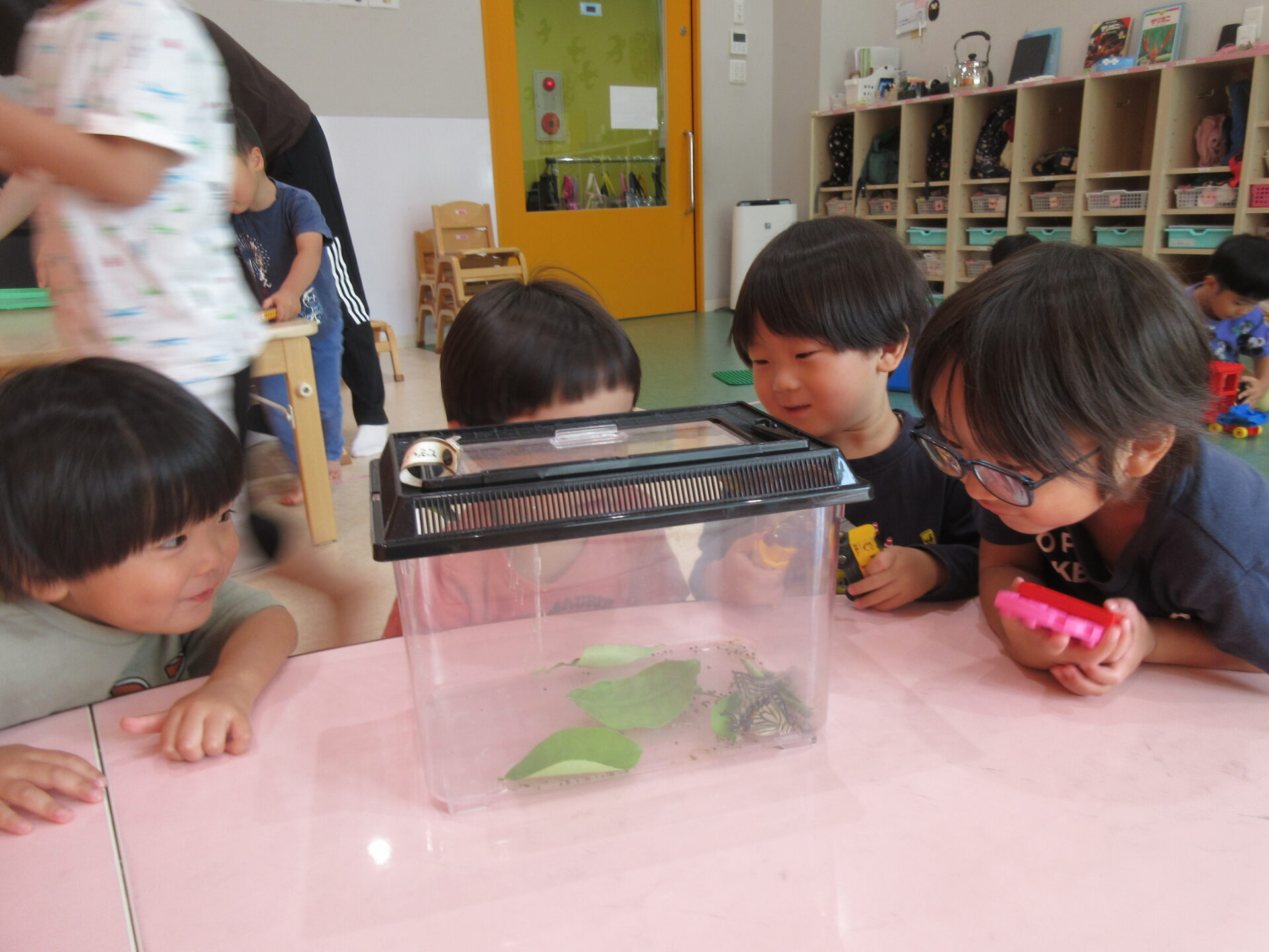 「❝さなぎ❞っていって、ちょうちょになる準備をしてるんだよ」と伝えると、興味津々で見つめる子どもたち。