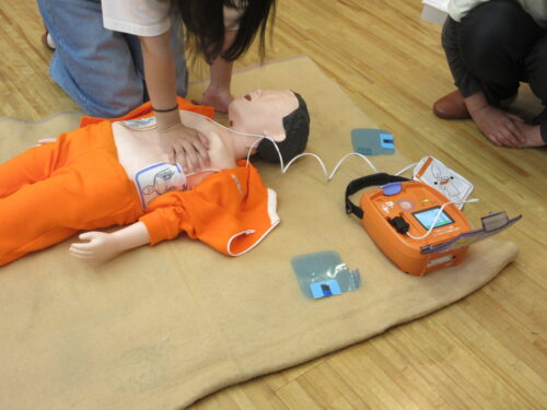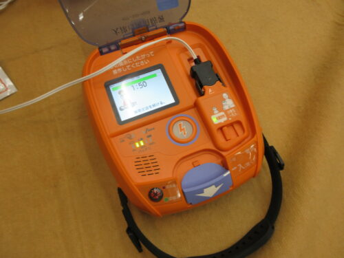 次に、AEDを使っての心肺蘇生。慌てず、ナビに従って操作をします。