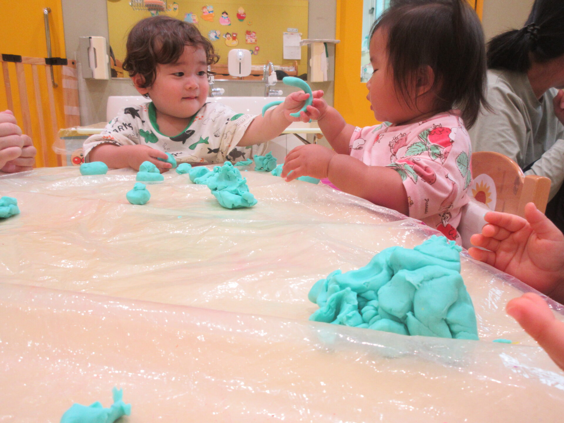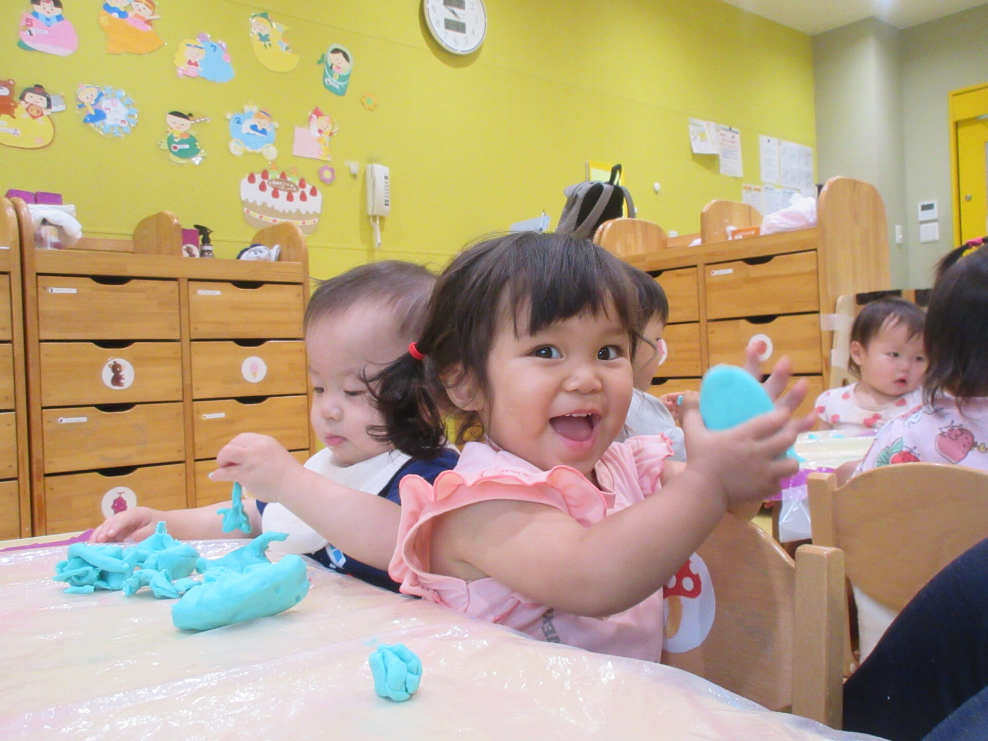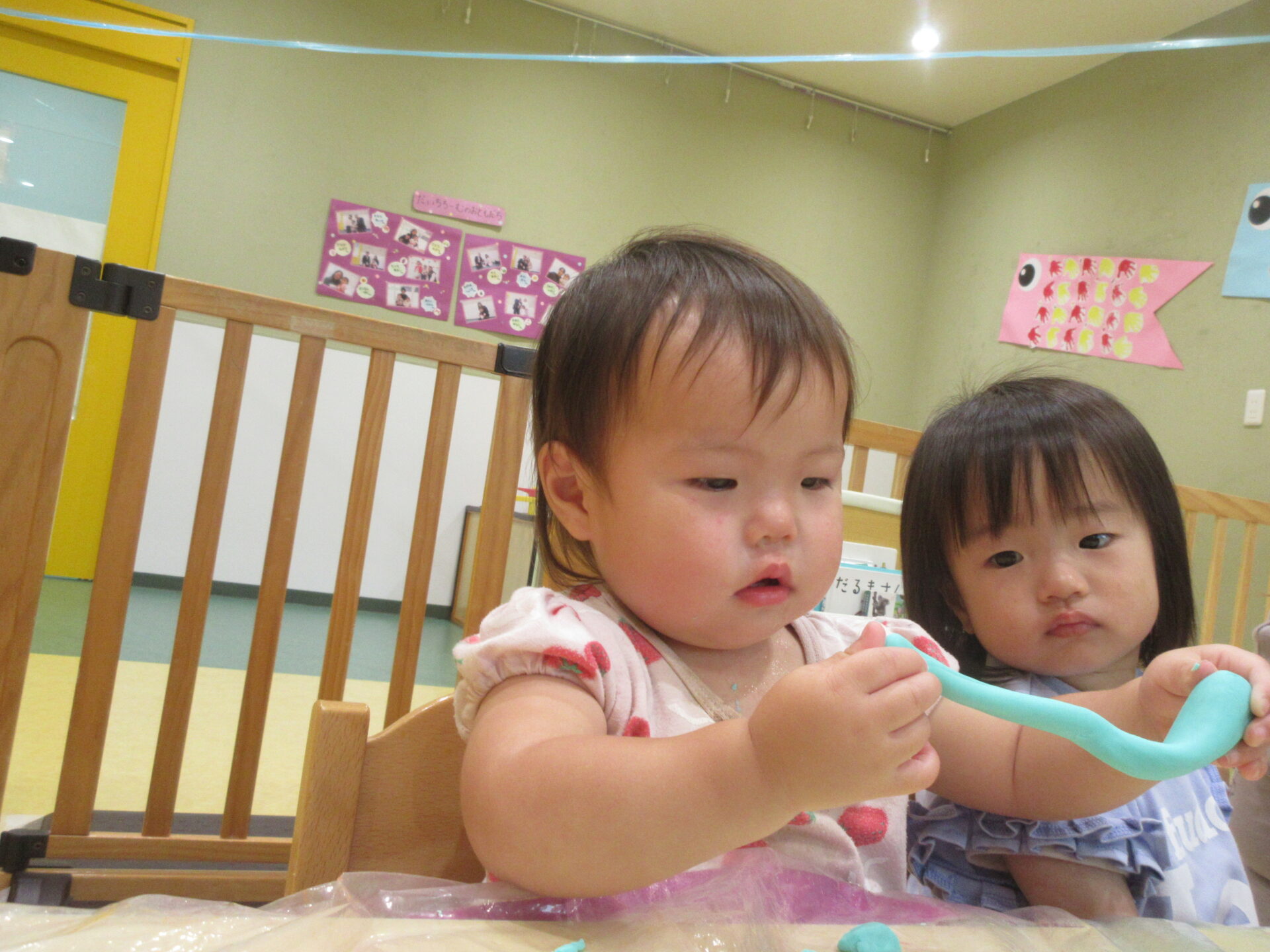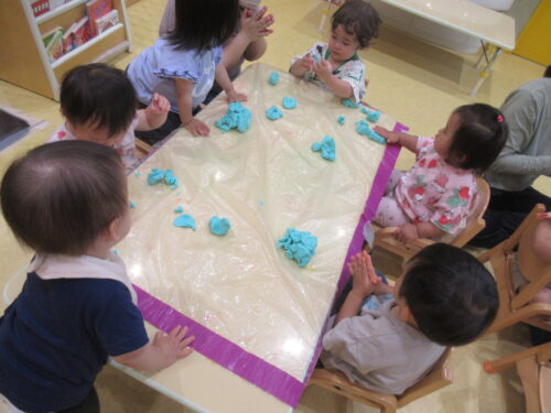 最初は「何これ~?」と不思議そうだったのですが、形が変わるのがおもしろかったようで、ツンツンと触ってみたり、びろーんとなった粘土を友だちと見せ合いっこしたり、思い思いに楽しんでくれました✨