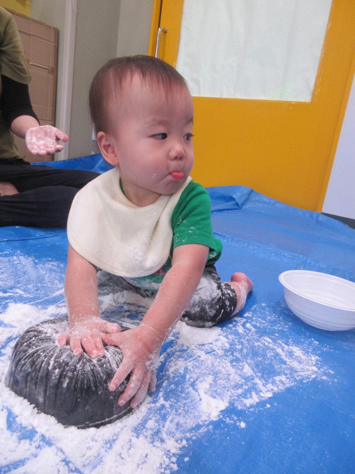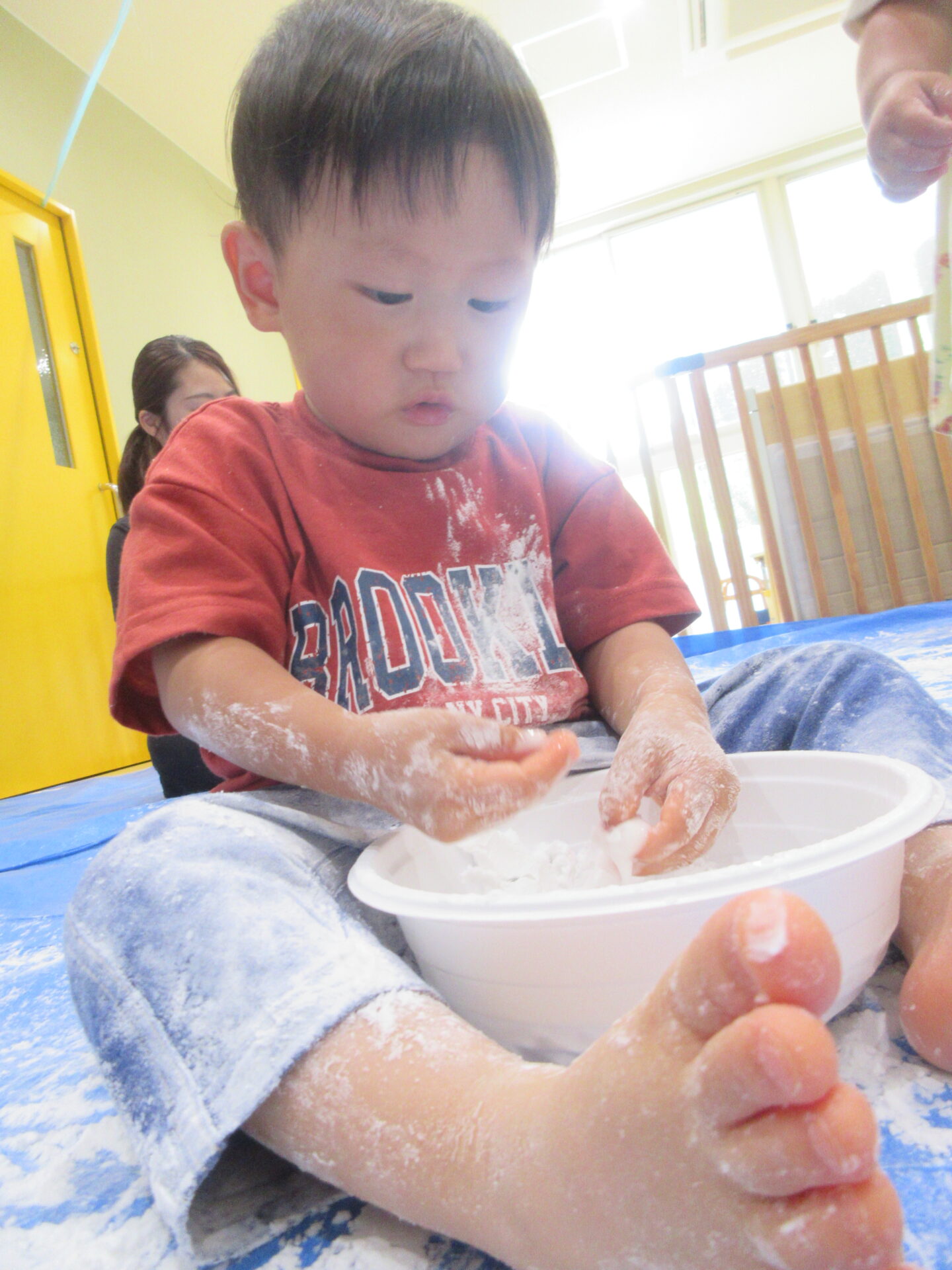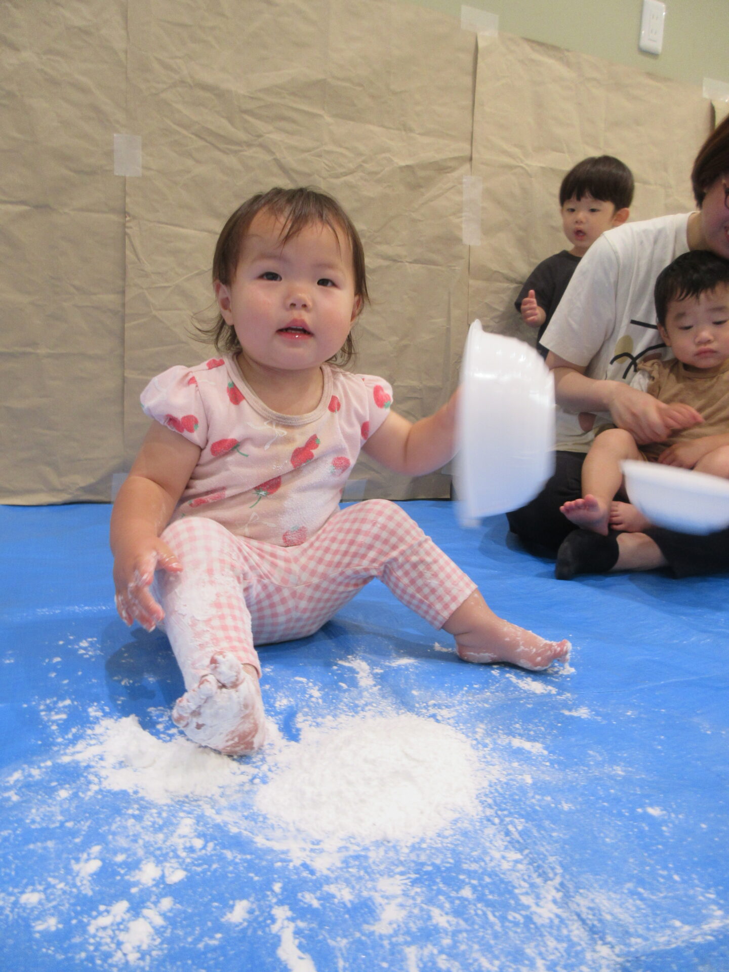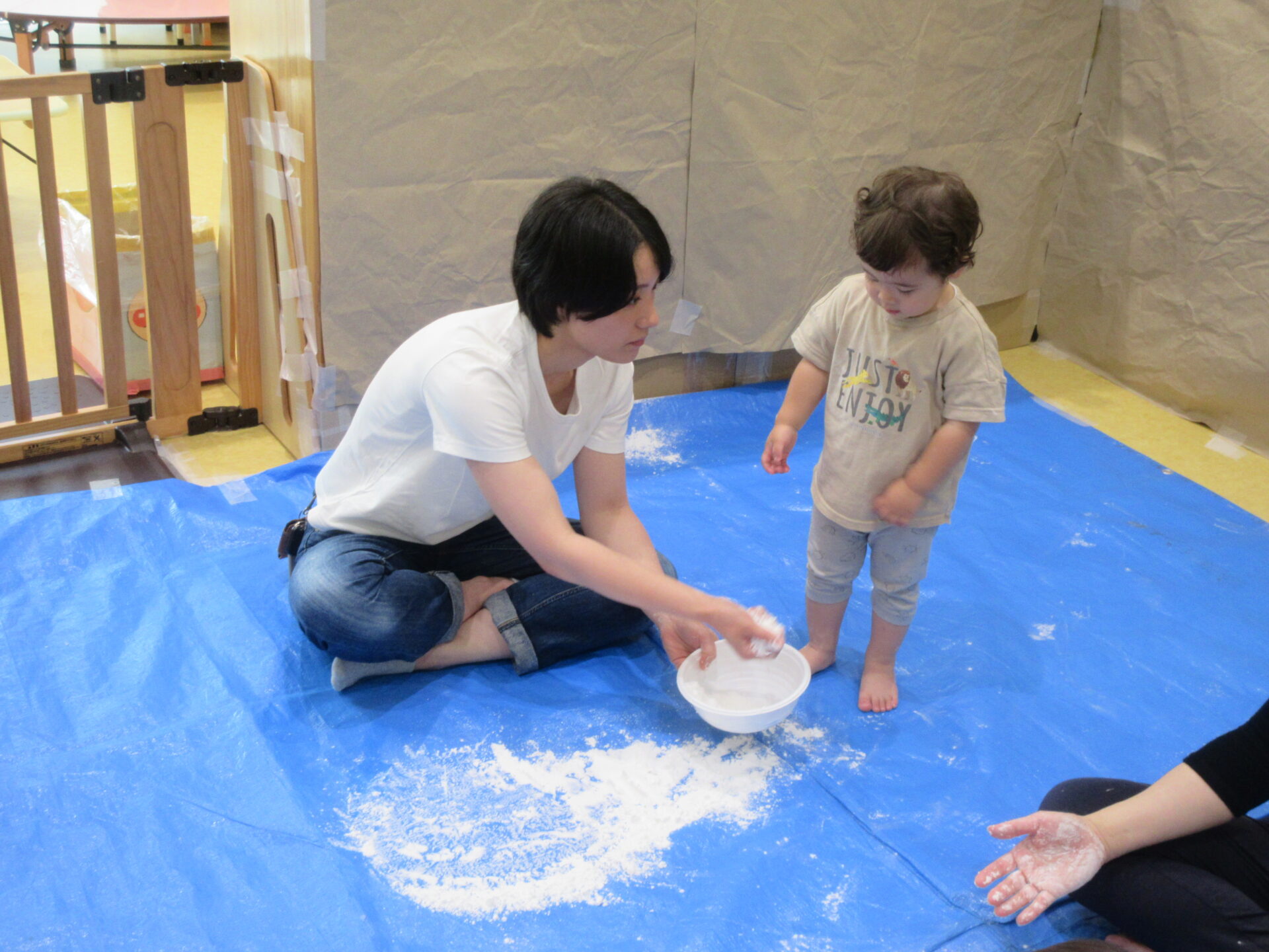 片栗粉をボウルに入れて1人ずつ渡すと、早速じゃばーっとするお友だちや、ちょっと警戒してお母さんと一緒になら・・・と少しだけ触ってみるお友だちと反応は様々でした。