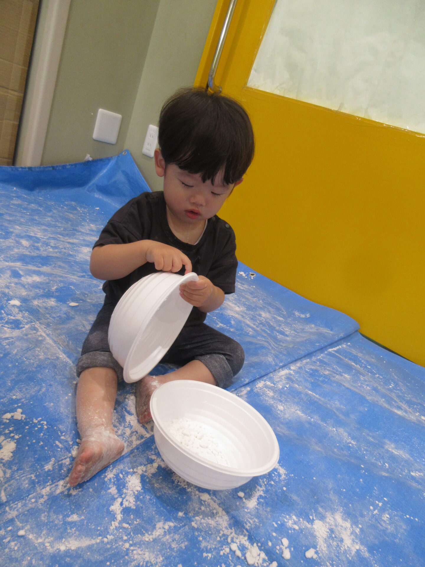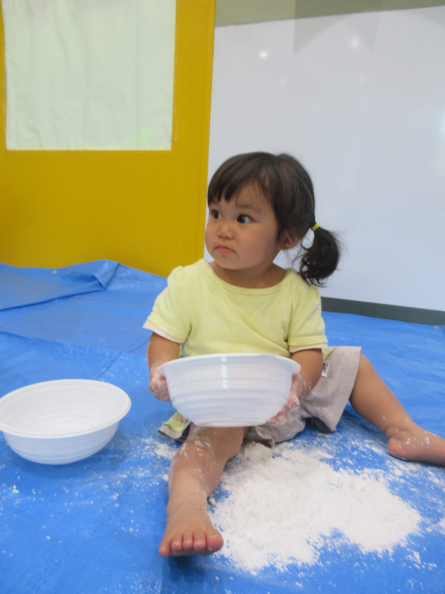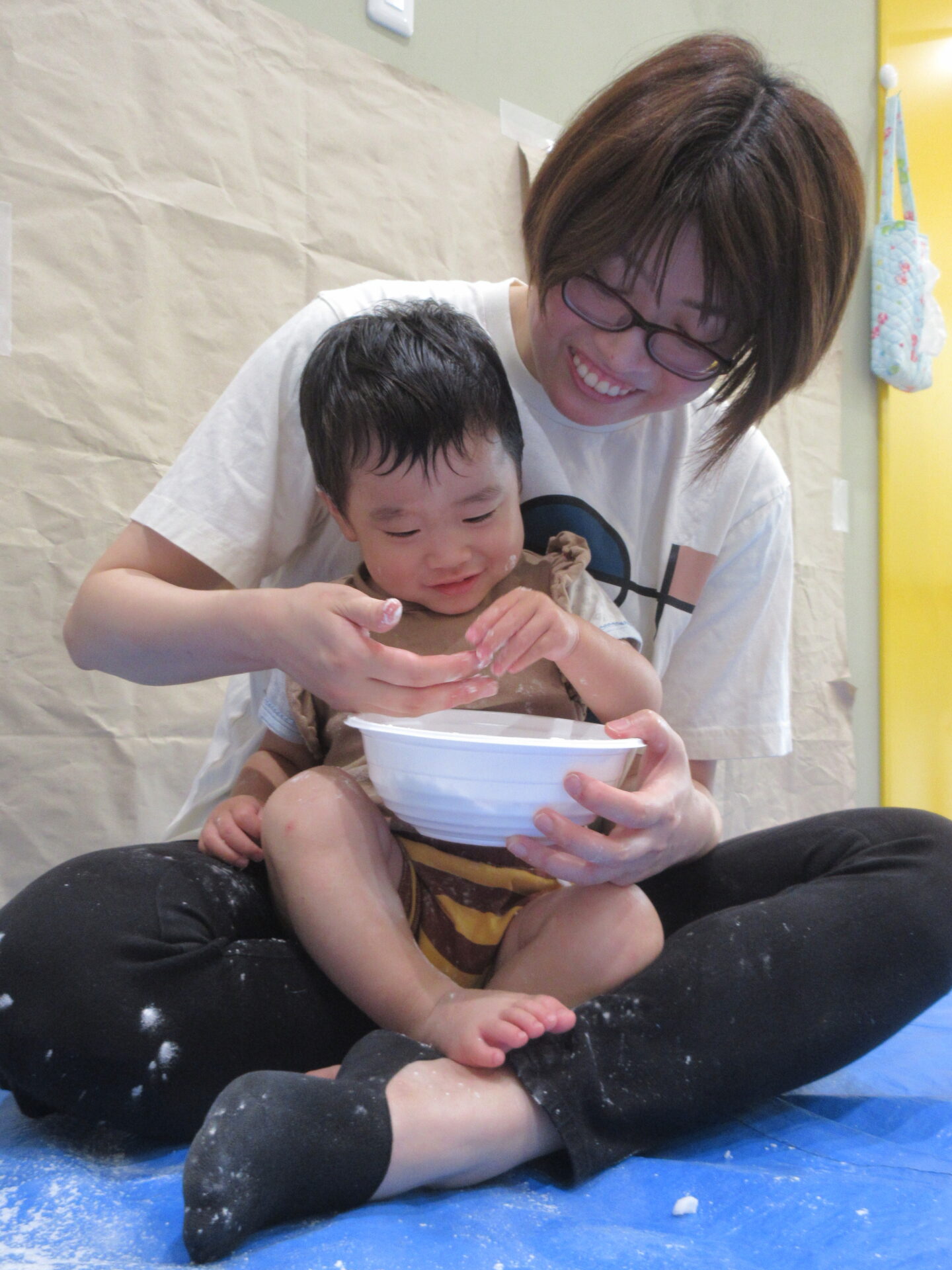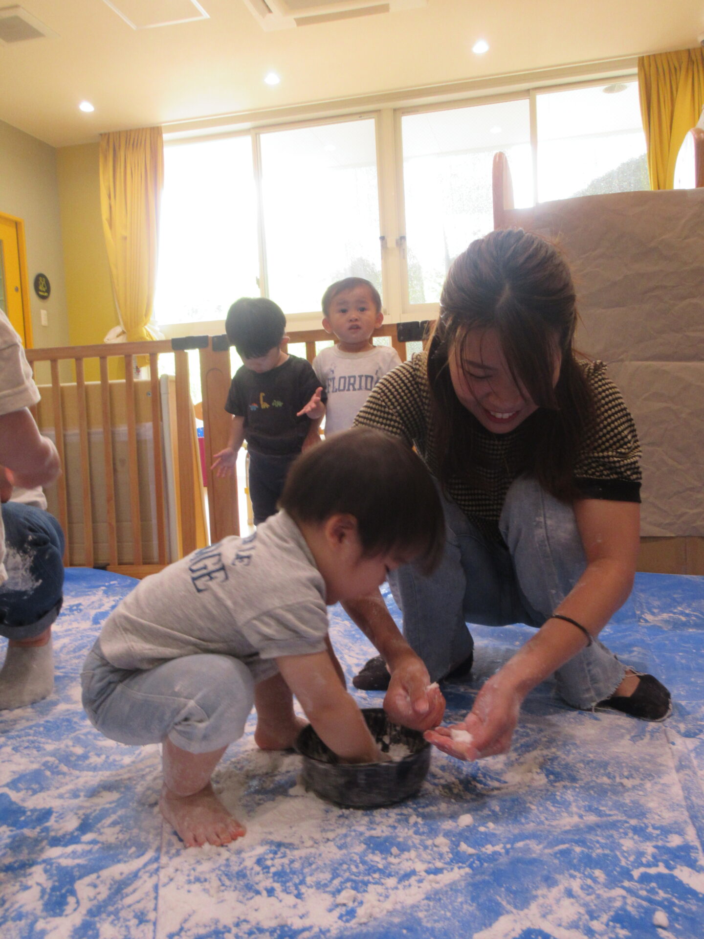 片栗粉をボウルに入れて1人ずつ渡すと、早速じゃばーっとするお友だちや、ちょっと警戒してお母さんと一緒になら・・・と少しだけ触ってみるお友だちと反応は様々でした。