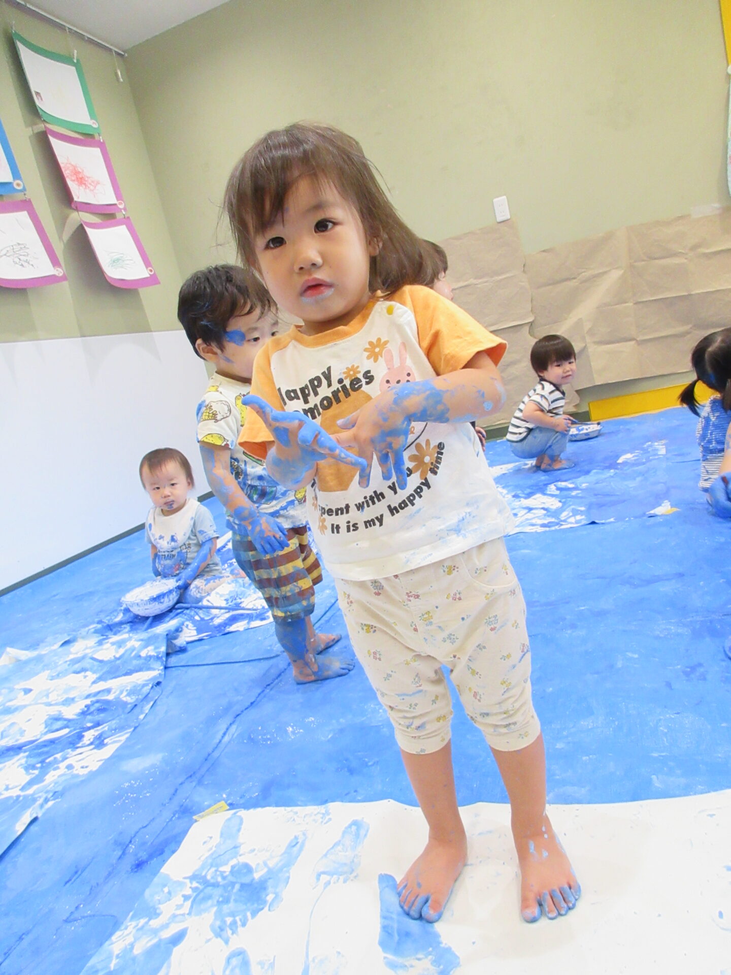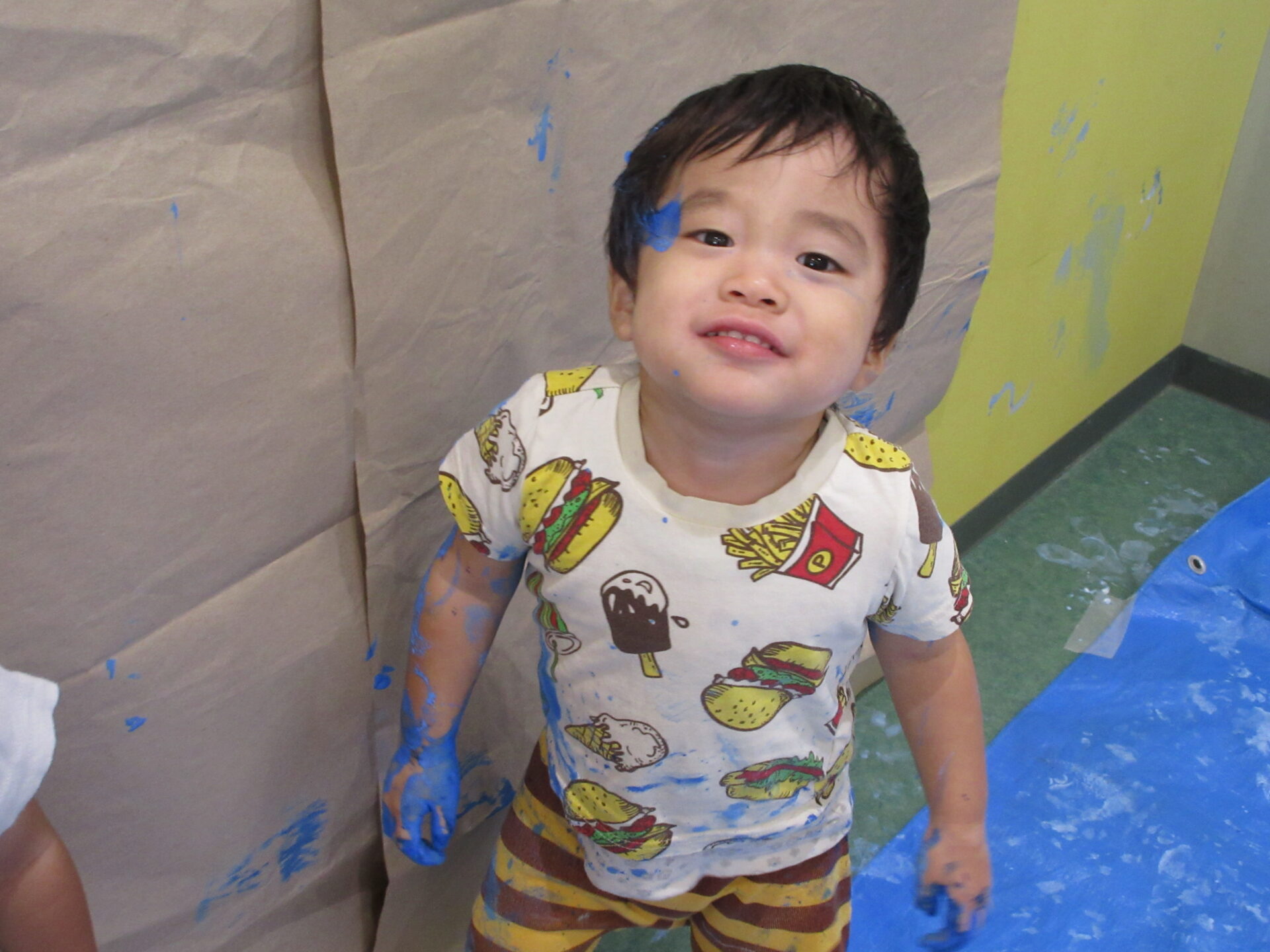 手足を使って、おもいきり絵の具あそびがしたい!と思って挑戦してみました。