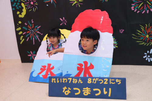 夏祭りのポスターが貼り出された日から、大きいクラスの子どもたちは「先生、何屋さんするん?」「あと何回寝たら夏祭りなんやろ…?」と、指折り数えて楽しみにしていました。