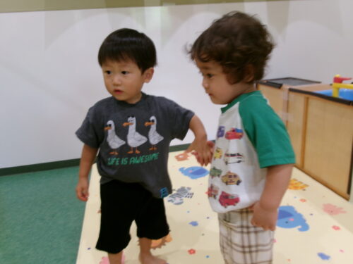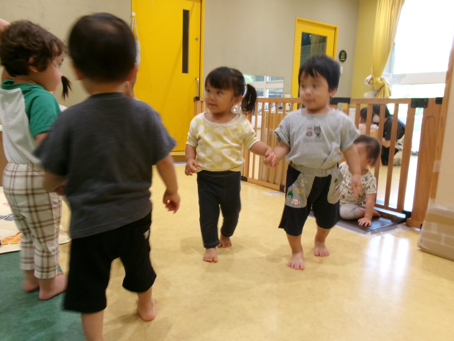 保育者と一緒に手をつないでみようとしますが、手の向きがおかしかったり、つないでいた手をはなしてしまったり…つなぐって難しい💦