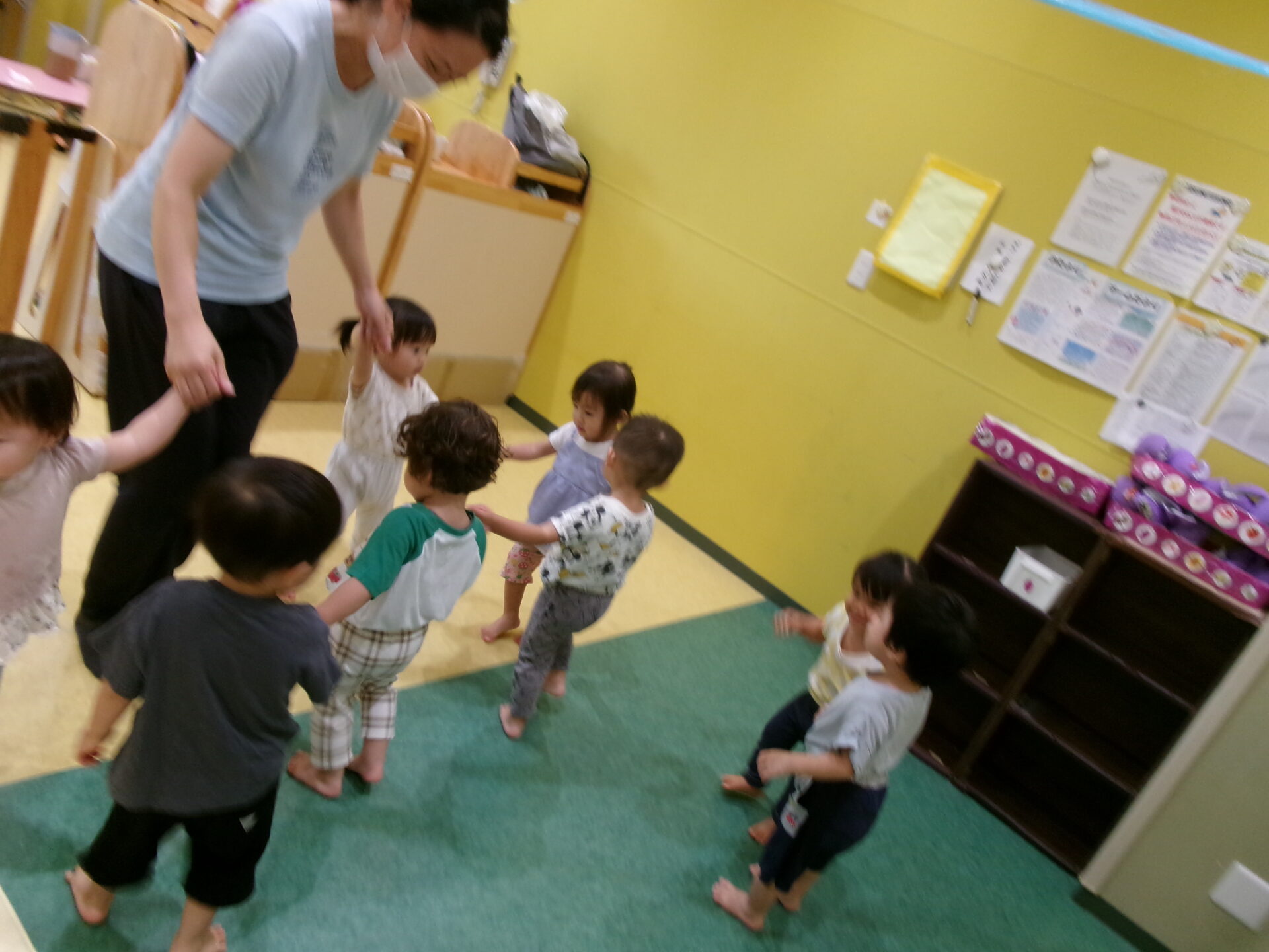 うさぎやあひるになってリズムあそびをした後、今度は手をつないで楽しいことができたらいいなぁ…との思いから、普段口ずさんでいた❝糸ぐるま❞を、少人数でやってみることに。