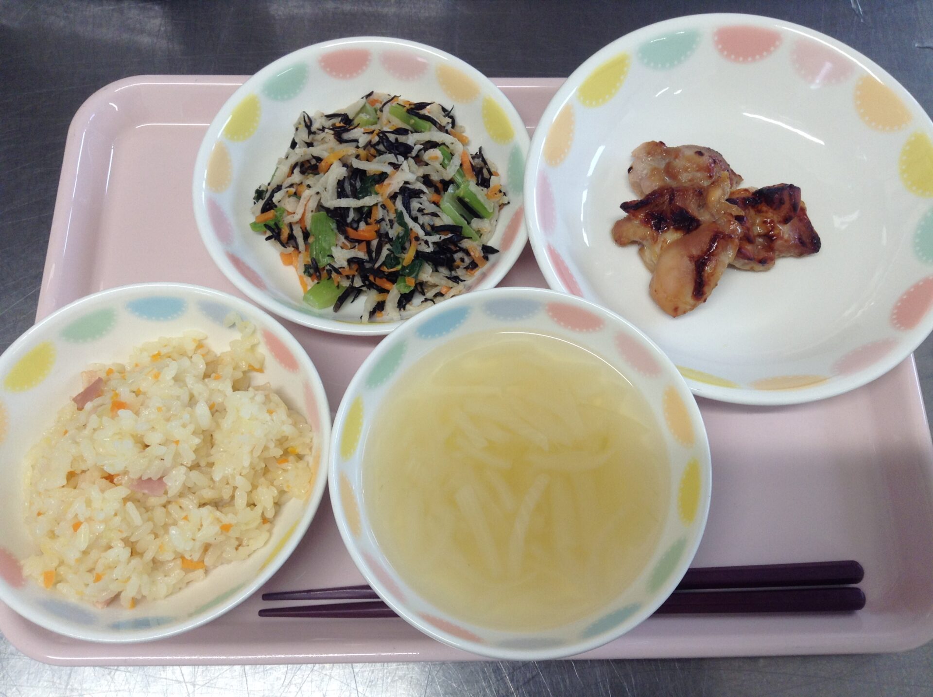 ベーコンピラフ、オニオンスープ、照り焼きチキン、切り干しサラダです。