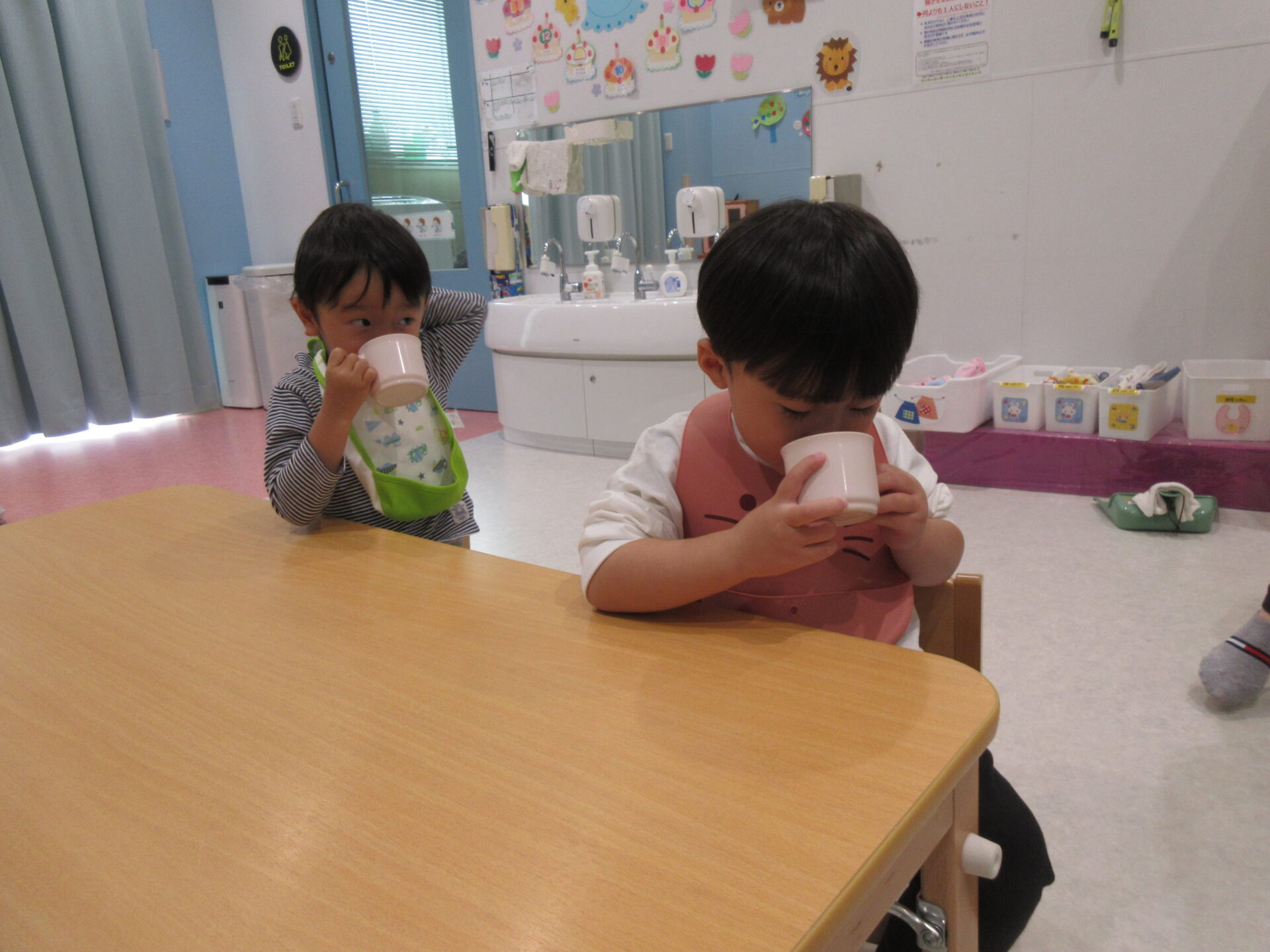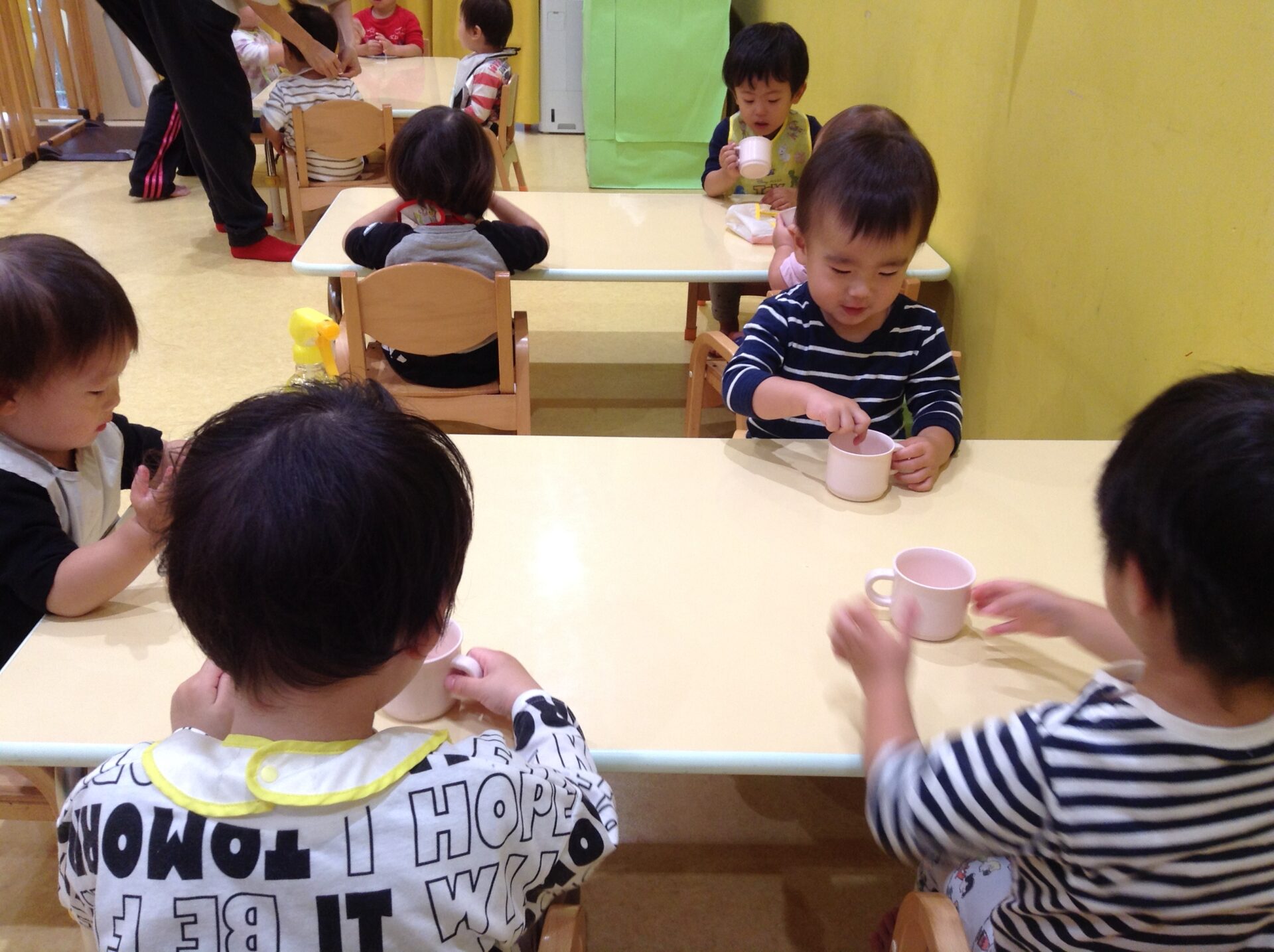 昆布とかつおでおだしを取り、0歳児さんから5歳児さんまで、コップで味見をしてもらったのですが、面白い反応が見られましたよ!!