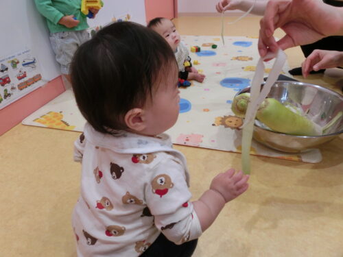ピーラーで皮をむくと、不思議そうな顔。とっても可愛かったです。