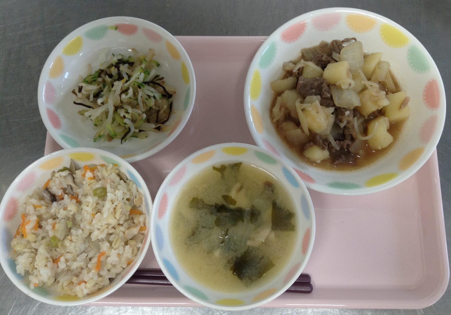 給食の献立は、もぶりごはん、しめじの味噌汁、呉の肉じゃが、もやしの塩昆布和えです。